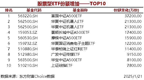 每经AI快讯,据东方财富Choice数据统计,昨日共7只股票型ETF当日份额增加超1亿份,富国中证A500ETF增加3.72亿份,华夏中证机器人ETF增加2.13亿份。