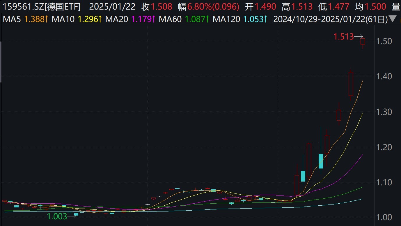 每经记者 叶峰 每经编辑 肖芮冬 德国ETF今日早盘大涨近7%,盘中溢价超37%,价格创上市新高。 值得注意的是,基金公司此前多次发布溢价风险提示公告,特此提示投资者关注二级市场交易价格溢价风险,投资者如果盲目投资,可能遭受重大损失。若该基金2025年1月22日二级市场交易价格溢价幅度未有效回落,该基金有权采取向深圳证券交易所申请盘中临时停牌、延长停牌时间等措施以向市场警示风险。 资料显示,德国ETF跟踪德国DAX指数,该指数代表了在法兰克福证券交易所上市的达到一定实力和盈利能力的最大的40家公司的表现。 |