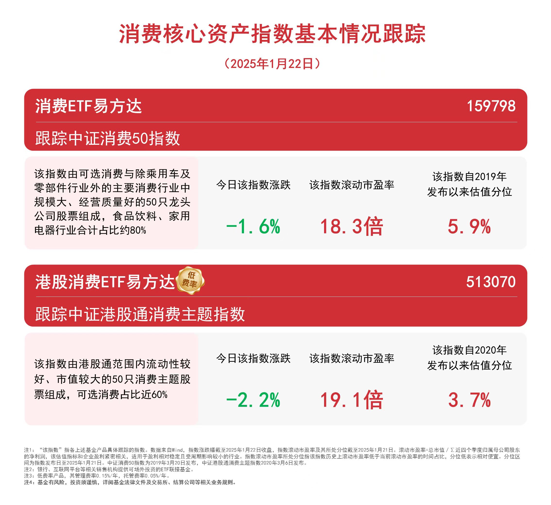 截至收盘,中证消费50指数下跌1.6%,中证港股通消费主题指数下跌2.2%。 工信部表示,2024年规模以上消费品工业增加值较上年增长4.5%,增速高于2023年同期3.6个百分点,在新一轮消费品以旧换新政策带动下,家电领域消 ...