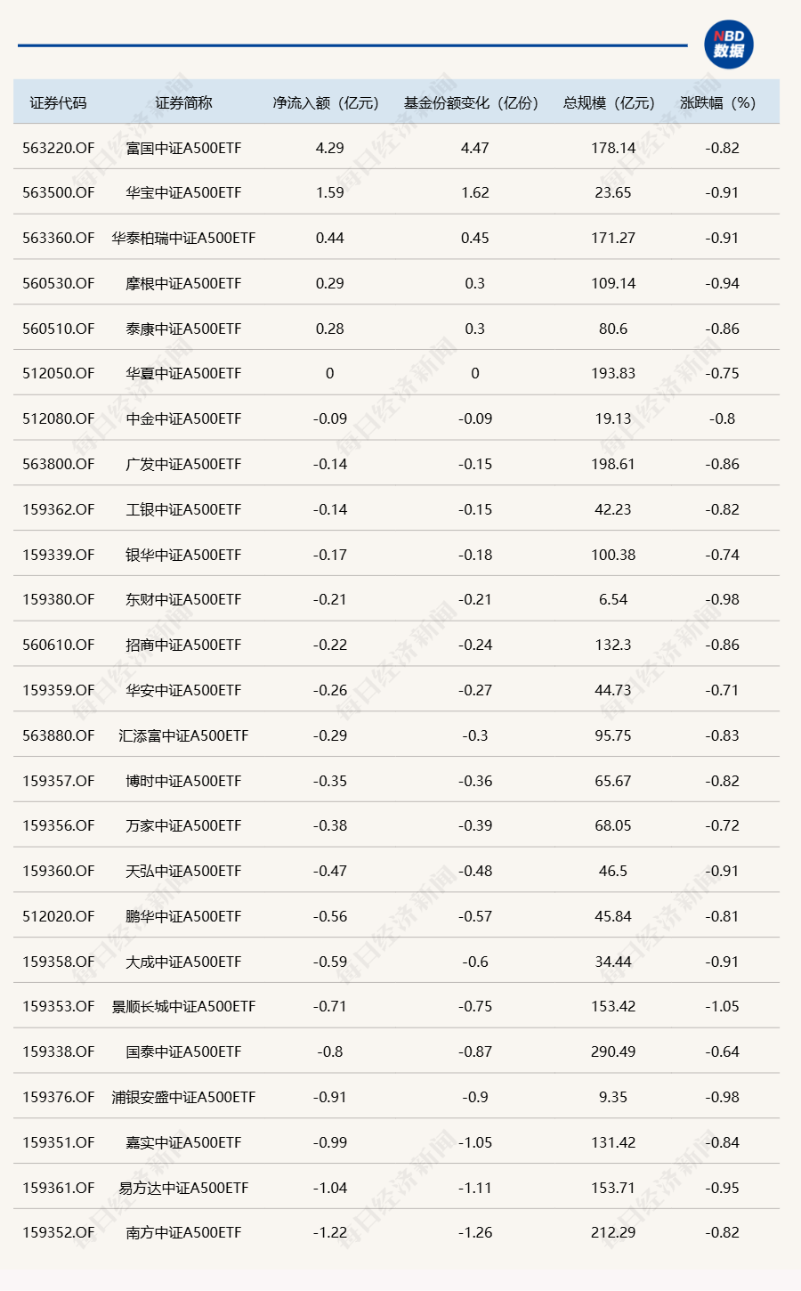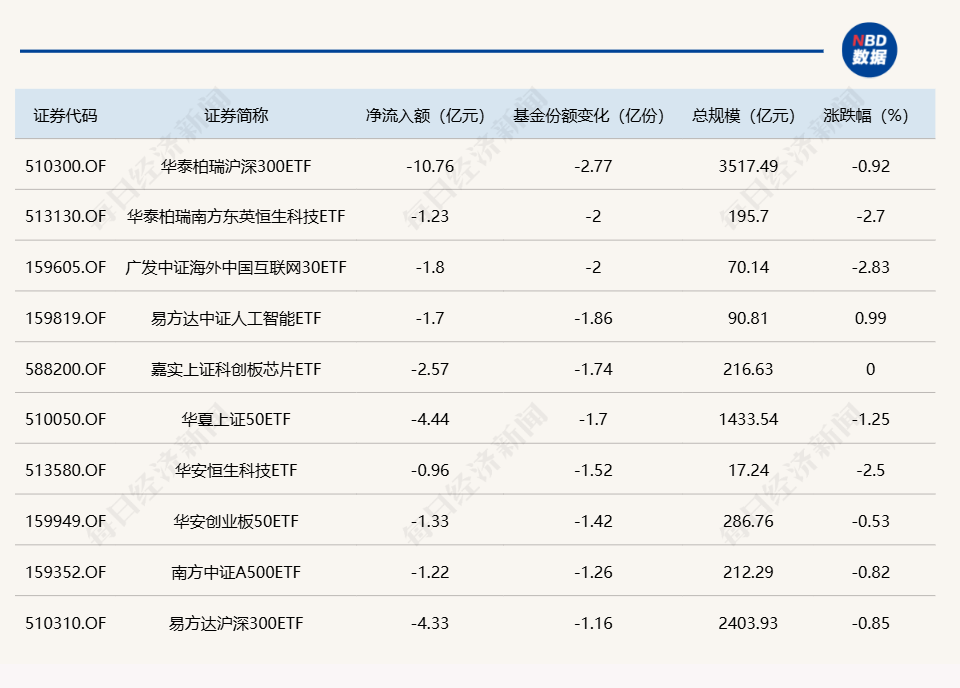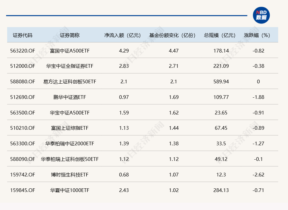 每经记者 肖芮冬 每经编辑 赵云 昨日市场全天震荡调整,沪指领跌,北证50指数跌超4%。板块方面,贵金属、铜缆高速连接、液冷服务器、CPO等板块涨幅居前,小红书概念、房地产、旅游、零售等板块跌幅居前。 全市场超4200只个股下跌。沪深两市全天成交额1.14万亿元,较上个交易日缩量694亿。 Wind数据显示,在1月22日的非货币ETF市场中,富国中证A500ETF基金份额增加4.47亿份,净流入额为4.29亿元;华宝中证全指证券ETF基金份额增加2.71亿份,净流入额为2.83亿元;易方达上证科创板50ETF基金份额增加2.1亿份,净流入额为2.1亿元。 与此同时,华泰柏瑞沪深300ETF基金份额减少2.77亿份,净流出额为10.76亿元;华泰柏瑞南方东英恒生科技ETF基金份额减少2亿份,净流出额为123亿元;广发中证海外中国互联网30ETF基金份额减少2亿份,净流出额为1.8亿元。 此外,昨日场内25只中证A500ETF合计净流出2.65亿元,其中有5只获得资金增持。 总体看来,Wind数据显示,1月22日全市场ETF份额达到26703.06亿份;总规模为36760.49亿元。 |