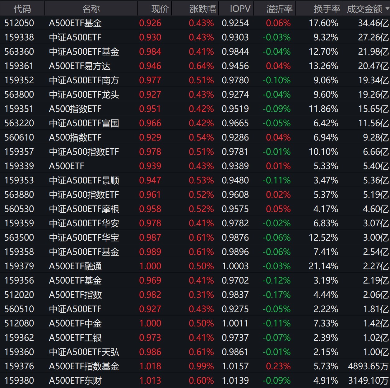 每经记者 叶峰 每经编辑 肖芮冬 市场早盘冲高回落,沪指领涨。中证A500指数上涨0.54%,成分股中上海电气涨停,蔚蓝锂芯、网宿科技涨超6%。 截至上午收盘,场内26只跟踪中证A500指数的ETF普涨约0.5 ...