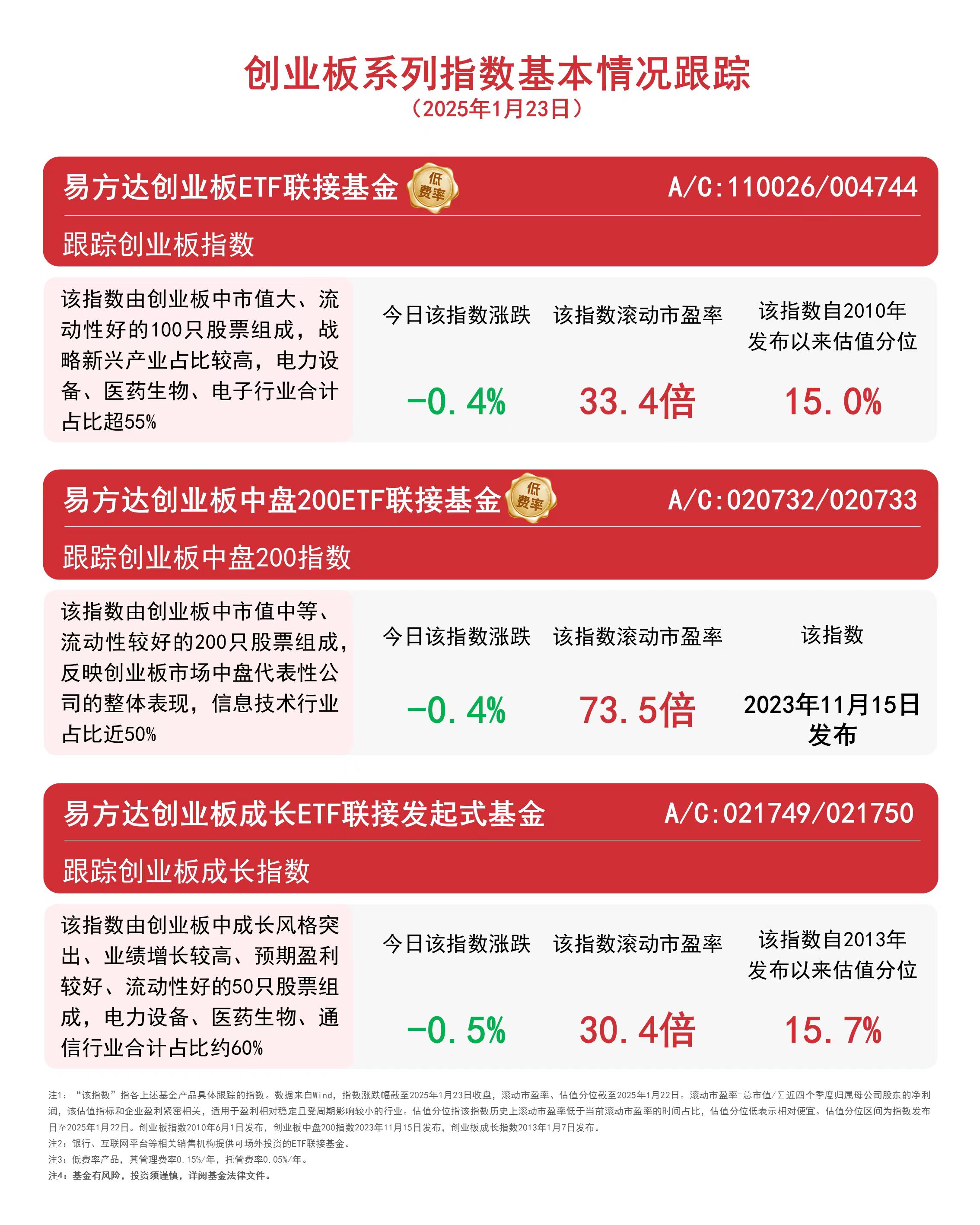 创业板高开低走,创业板中盘200指数早盘一度涨超3%,午后回落。截至收盘,创业板指数、创业板中盘200指数均下跌0.4%,创业板成长指数下跌0.5%。