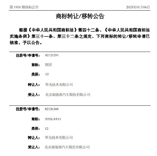 华为技术将其注册的“STELATO”图形商标转让给了北京新能源汽车股份有限公司,这些商标均属于运输工具国际分类,申请时间为去年6月至11月,目前大多数商标状态仍在等待实质审查,部分则处于驳回复审中。此外,华为已 ...