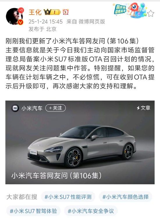同辰科技讯 ,1月24日下午消息,市场监管总局今日披露,日前,小米汽车科技有限公司根据《缺陷汽车产品召回管理条例》和《缺陷汽车产品召回管理条例实施办法》的要求,向国家市场监督管理总局备案了召回计划。决定自即日起,召回2024年2月6日至2024年11月26日生产的部分SU7标准版电动汽车,共计30931台。 对此,小米集团公关部总经理王化在微博转载小米汽车发布的《小米汽车答网友问(第106集)》,并表示,“主要信息就是关于今日我们主动向国家市场监督管理总局备案小米SU7标准版OTA召回计划的情况,现就网友关注问题集中作答。特别提醒,如果您的车辆在计划车辆之中,不必惊慌,可在收到OTA提示后升级即可,再次感谢大家的支持和理解。” 小米汽车发布的《小米汽车答网友问(第106集)》表示,此次OTA召回仅通过对车辆进行免费远程升级(OTA)即可完成,不需要车辆进店进行任何检查或处理。我们将以短信、手机APP等方式通知相关车主,用户也可致电小米汽车科技有限公司客户服务热线,了解更多关于此次OTA召回的详细信息。 既然是软件升级,直接通过远程OTA不就行了么,为什么要叫主动召回?小米汽车表示, 我们将通过汽车远程升级(OTA)技术,为召回范围内的标准版小米SU7车辆免费升级软件。本次OTA软件升级召回,意在进一步提升智能泊车辅助功能的可靠性。小米汽车永远把用户安全作为第一原则,虽然本次升级不需要物理更换任何零件,但我们仍按照召回的程序进行管理和备案。 只有标准版小米SU7在此次OTA召回范围内?小米SU7 Pro和Max版本不需要么?对此,小米汽车回应称,本次OTA软件升级召回,仅针对24年11月26号前生产的部分小米SU7标准版车型,并不涉及其他版本的小米SU7。我们已经通过APP和短信方式通知了涉及OTA召回车辆的主控账号所有人,将通过推送OTA升级的方式强化其智能泊车功能。 “本次召回涉及2024年2月6日至2024年11月26日生产的部分标准版SU7”,小米SU7标准版不是2024年3月28日发布,4月3日才交付么,为什么2月份就开始生产了? 小米解释,“在小米SU7正式上市前,为了使其经历更细致、更全面的长时间路测,我们生产了大量仅用于内部测试的工程车辆。其中有部分测试车也在此次通过OTA软件升级召回的车辆范围之内。” 至于,为什么小米SU7标准版智能泊车事故11月发生,现在才发公告?小米汽车表示,11月14日事情发生后我们第一时间确定了问题原因,为云端服务偶发故障引起的软件授时同步异常,并通过云端服务先实施了有效的防范措施,随后又在智能泊车辅助中加入了更多冗余保护策略措施,已确认排除风险可能。此后,又经过两个月的长时间版本反复测试验证,验证确认安全稳妥。在与主管部门沟通和协商后,本着对用户认真负责的态度,主动发起了本次OTA软件升级召回。 来源:同辰网 (责任编辑:宋政 HN002)