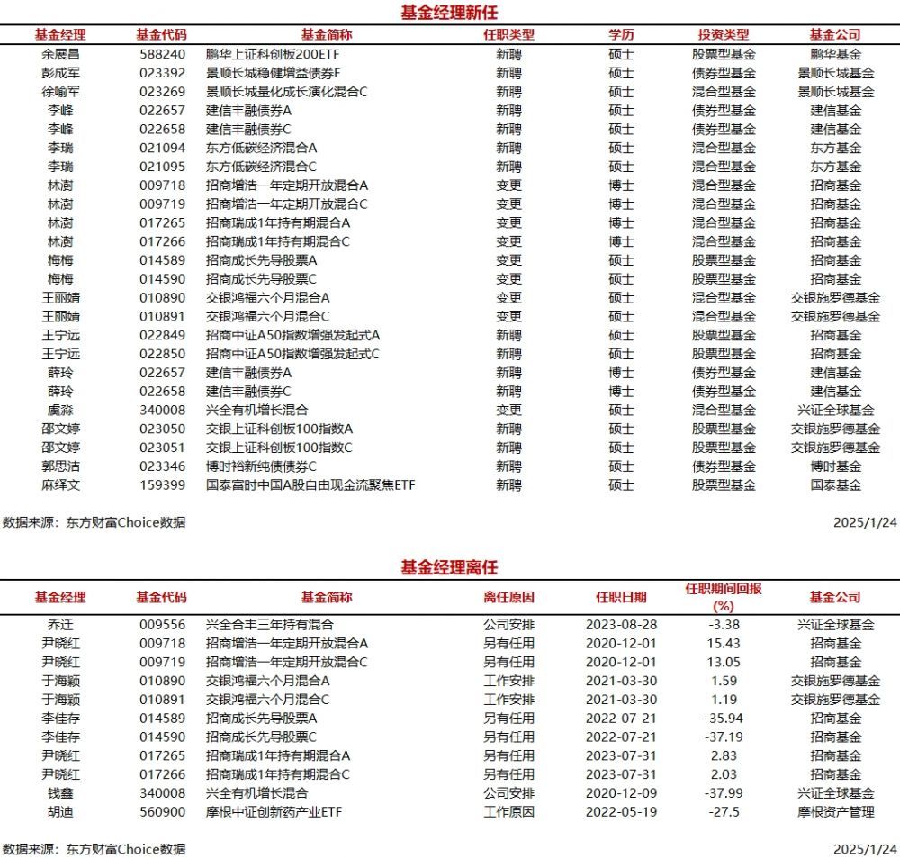 每经AI快讯,据东方财富Choice数据统计,今日新聘基金经理14人,涉及22只基金(A/C类分开计算),主要来自招商基金、建信基金等公司。另外,今日有6位基金经理离任。