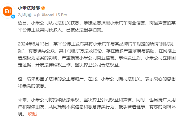今天,小米法务部官方微博发文称,涉嫌恶意抹黑小米汽车商业信誉、商品声誉的某平台博主及其同伙多人,已被依法缉拿归案。 小米法务部在发布的原文中表示,近日,小米公司从司法机关获悉,涉嫌恶意抹黑小米汽车商业信誉、商品声誉的某平台博主及其同伙多人,已被依法缉拿归案。 去年8月,百万粉丝汽车博主发布了一条名为《当小米SU7撞上一辆极氪007》的视频,引发广泛关注。视频显示,该博主用小米SU7与一辆极氪007进行了对撞测试,碰撞速度为60公里/小时,按照90%的重叠率进行碰撞,结果小米SU7遭遇了小电瓶断电、车门无法打开的情况。 针对此事,小米汽车进行了初步分析。小米汽车方面称,这一所谓“测试”是设置不严谨、记录不完整、结论不科学的。 图片来源:小米汽车微信公众号 小米汽车方面强调称,此前小米SU7在开发过程中,已经进行过严苛的碰撞测试,无安全隐患,且并未出现视频中所述问题。 小米汽车呼吁,车辆撞击测试是一项复杂、严谨且异常严肃的测试,应当交由专业机构进行。 随后,发布视频的测试博主发布了道歉视频,进行了说明:“关于网友反馈的所有问题,我们一一进行了反思和复查,并且用过去的一天重新找了一辆小米SU7进行核实,发现在正极电源线处理方面可能存在插头安装不紧的问题,而由于实际拧紧力矩我们已经无从考证,因此电瓶正极电源线是被撞掉的这一说法表述不准确,并且该表述会影响后续部分结论判断,导致内容给观众造成了困扰和误导,在此给小米汽车以及所有之前观看本期内容的朋友郑重道歉。”