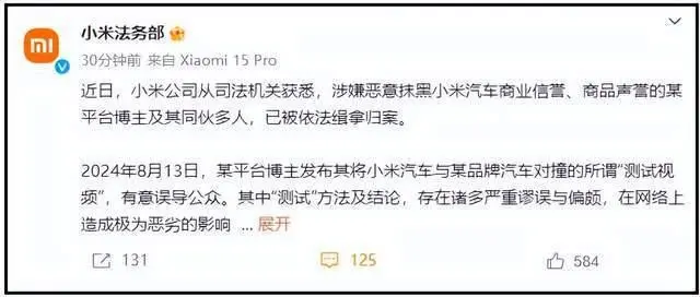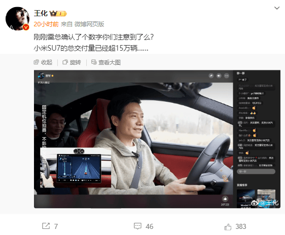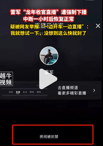 雷军又上热搜!这次是一边开车一边直播被网友举报了。 雷军直播被封 1月25日,雷军开启龙年收官直播。下午1点48分,雷军的抖音直播间突然遭到封禁,网友截图显示雷军边开车边直播被举报封禁。 据报道,有网友于下午1点44分发布视频表示,其举报了雷军一边开车一边直播。该网友发布的“直播举报反馈”截图显示,该网友于下午1点36分提交对用户雷军直播内容的举报。 下午1点57分,该网友再次发布作品,为一张“举报结果通知”的截图,内容为:“你举报的用户【雷军】的直播内容,经我们核实存在违规行为,已对用户进行【中断直播间】处理,感谢你的监督!” 举报雷军开车直播的网友回应 :“不好意思啊雷总,我就想试一下,没想到这么快就封了,看来抖音谁也不惯着呀。” 雷军在抖音的直播中断了大约一个小时,到下午2点52分,雷军再次开播。 今日早间,雷军发博:给大家拜个早年,提前祝大家新年快乐,开车一定注意安全! SU7的总交付量超过15万辆 小米集团公关部总经理王化在微博上发文称,在25日的直播中,小米创办人、董事长兼CEO雷军确认了一个数字:小米SU7的总交付量已经超过15万辆。 2024年12月31日,雷军在跨年直播活动中透露,2024年小米汽车交付超过13.5万辆,2025年交付目标30万辆。 涉嫌恶意抹黑小米,多人被缉拿 小米法务部1月25日在微博发布消息称,近日从司法机关获悉,涉嫌恶意抹黑小米汽车商业信誉、商品声誉的某平台博主及其同伙多人,已被依法缉拿归案。 小米表示,2024年8月13日,某平台博主发布其将小米汽车与某品牌汽车对撞的所谓“测试视频”,有意误导公众。其中“测试”方法及结论,存在诸多严重谬误与偏颇。 本文首发于微信公众号:e公司。文章内容属作者个人观点,不代表西瓜财经立场。投资者据此操作,风险请自担。 (责任编辑:宋政 HN002)