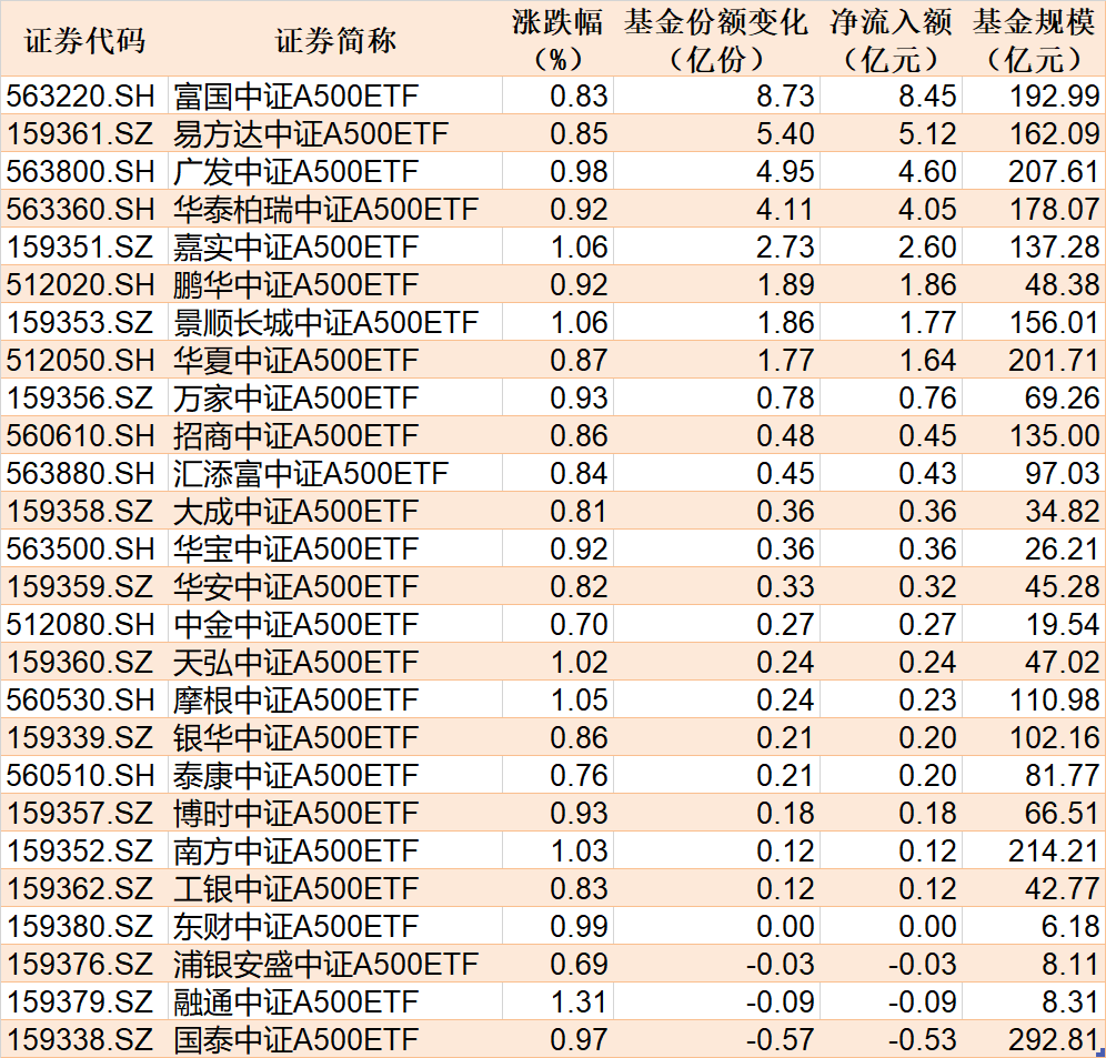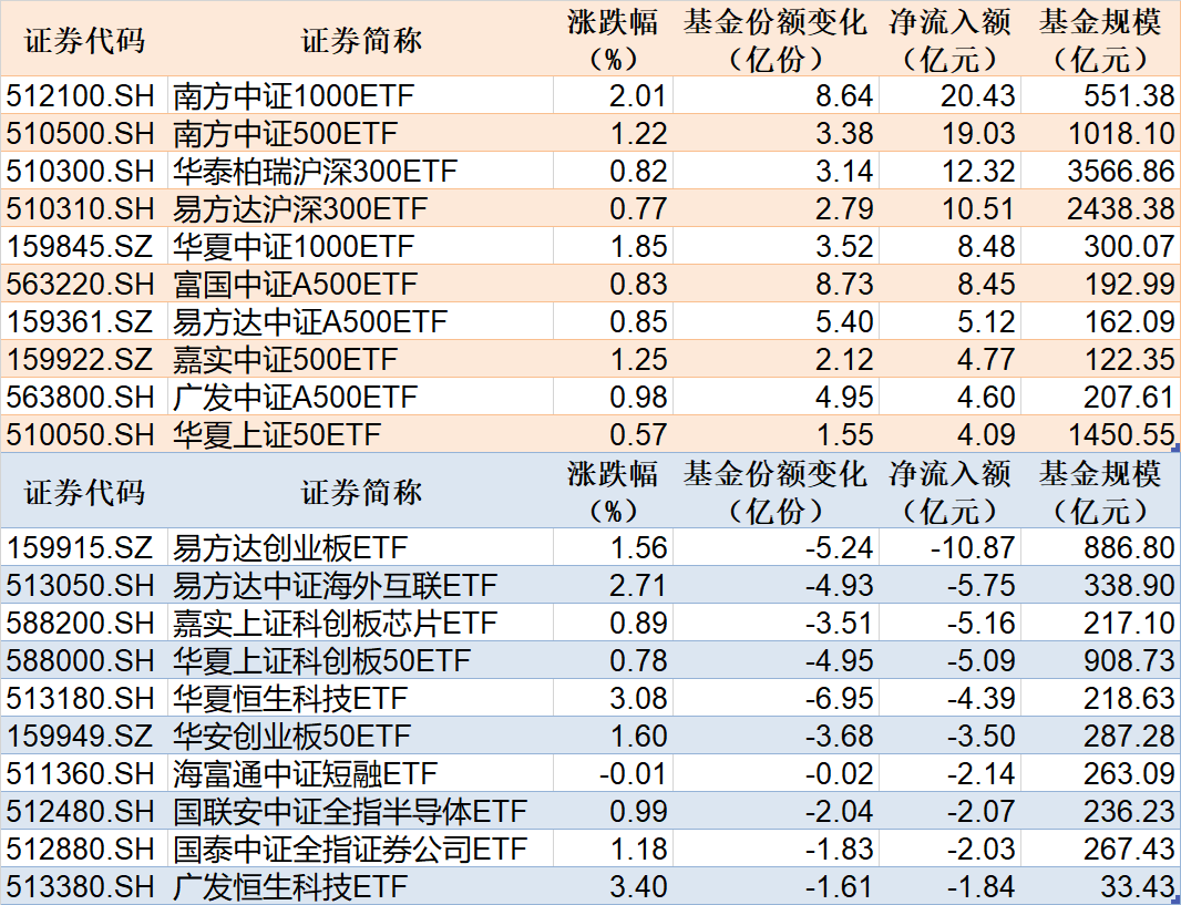 每经记者 叶峰 每经编辑 彭水萍 上周五,两市主要股指盘中强势拉升,深证成指、创业板指涨超1%。盘面上看,软件、传媒、汽车、半导体、旅游、钢铁、有色、券商等板块走强,智谱AI、财税数字化、AI应用、信创概念等活跃,地产等板块走弱。 Wind数据显示,在1月24日的非货币ETF市场中,南方中证1000ETF基金份额增加8.64亿份,净流入额为20.43亿元;南方中证500ETF基金份额增加3.38亿份,净流入额为19.03亿元;华泰柏瑞沪深300ETF基金份额增加3.14亿份,净流入额为12.32亿元。 与此同时,易方达创业板ETF基金份额减少5.24亿份,净流出额为10.87亿元;易方达中证海外互联ETF基金份额减少4.93亿份,净流出额为5.75亿元;嘉实上证科创板芯片ETF基金份额减少3.51亿份,净流出额为5.16亿元。 此外,上周五场内26只中证A500ETF合计净流入33.67亿元,其中有22只获得资金增持。 总体看来,Wind数据显示,1月24日全市场ETF份额达到26778.44亿份;总规模为37243.40亿元。份额增加最大的行业为医药,目前有9只基金跟踪;份额增加最大的主题为中证酒指数,有1只基金跟踪。份额增加最大的指数标的为中证A500(+1.43%),有29只基金跟踪;收益最高的指数标的为软件指数(+4.66%),有3只基金跟踪。 |