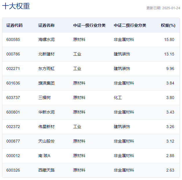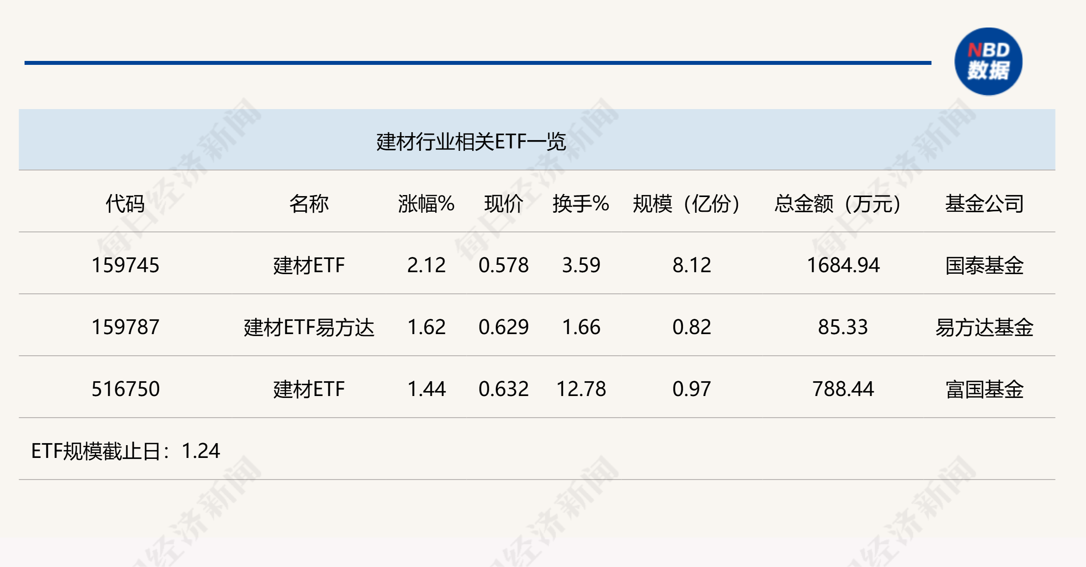 每经记者 刘明涛 每经编辑 叶峰 今日上午,除了DeepSeek AI概念股集体大涨外,业绩稳定的蓝筹股整体也有不错表现,建材、银行、电力处于领涨位置,在行业ETF市场,建材ETF(159745)半日涨幅超2%,达到2.12%,反弹明显。 投资逻辑来看,国家统计局数据显示,12月份,限额以上单位家具类商品零售额同比增长8.8%,连续四个月正增长;建筑及装潢材料类增长0.8%,连续两个月增长。2024年,中央向地方下达1500亿元超长期特别国债资金,支持各地因地制宜实施消费品以旧换新。近期多次会议召开,明确推进提振消费行动,加力扩围消费品以旧换新,随着家装细则措施落地,叠加政策刺激下存量房翻新和旧改需求释放,有望进一步促进建材消费需求恢复。 点评:建材ETF(159745)今日上午涨幅达到2.12%,该ETF规模为8.12亿份,半日成交金额为1685万元,其追踪的是中证全指建筑材料指数,追踪该指数的ETF还有建材ETF易方达(159787)和建材ETF(516750)。 中证全指建筑材料指数从中证全指指数中选取业务涉及建筑材料领域的上市公司证券作为指数样本,以反映该主题上市公司证券的整体表现。 中证全指建筑材料指数主要权重股 |