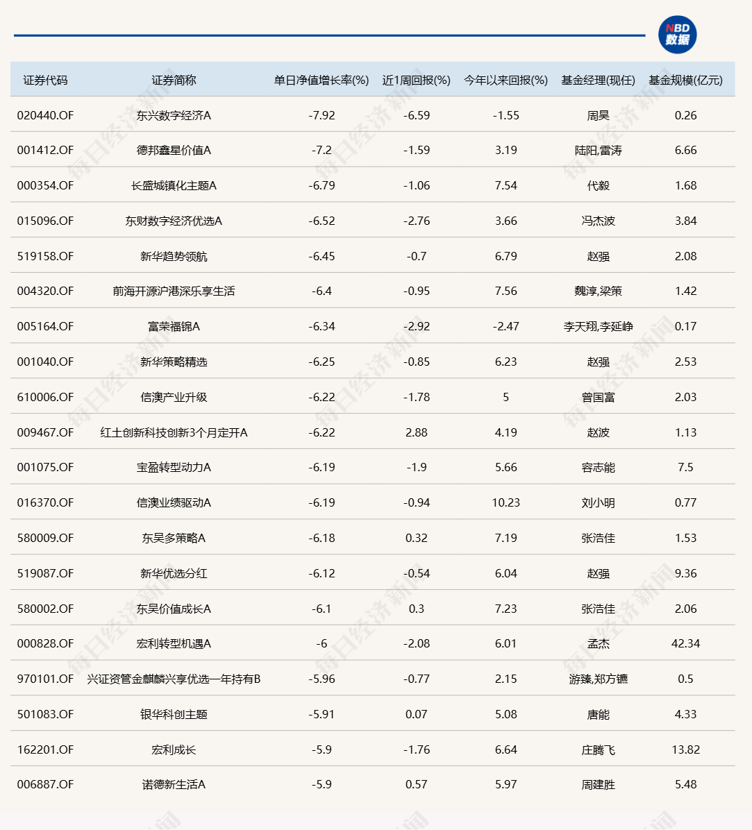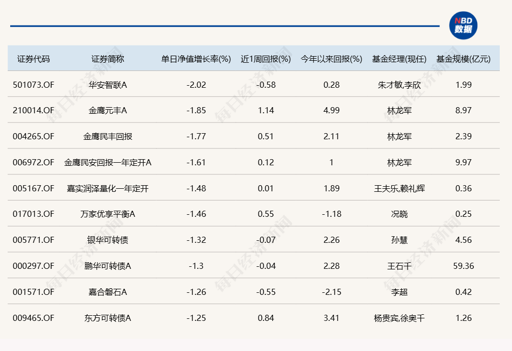 每经记者 肖芮冬 每经编辑 赵云 1月27日,大盘全天走势分化,沪指尾盘竞价时分跌破红盘,创业板指领跌。盘面上,午后资金无心恋战,万亿大权重强撑沪指,四大行普涨2%。尾盘4只主流沪深300ETF异常放量但效果甚微,三大指数全部收于日低。全天个股涨少跌多,跌停家数明显增多。A股全天成交1.13万亿元,较上日缩量约1000亿元。 下面一起来看今天公募基金的表现。 (注:榜单1、2仅选取灵活配置型、偏股混合型和普通股票型三类产品作为主动基金的代表,纳入统计;债基相关榜单包括各类主、被动债券型基金) 1.单日涨幅榜 2.单日跌幅榜 3.单日债基涨跌幅榜 4.晚间值得关注的消息 【英伟达盘前跌掉一个英特尔加一个AMD】 1月27日美股盘前,英伟达股价一度跌超12%,市值蒸发预计将超3000亿美元,这比AMD和英特尔的市值总和还要高。 |