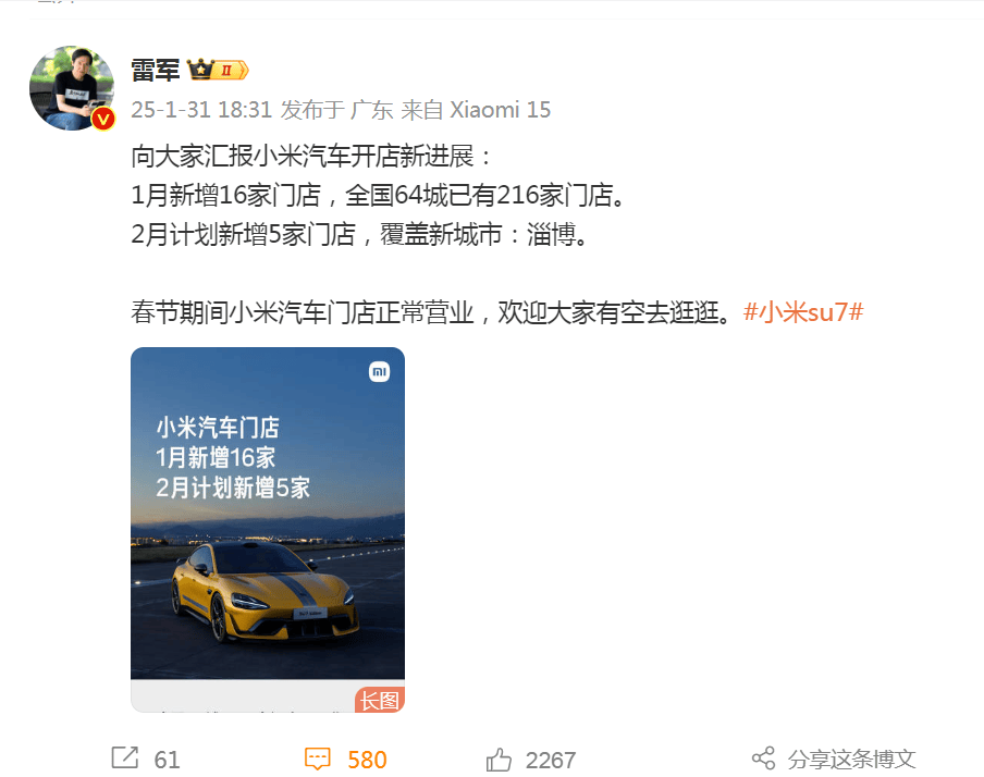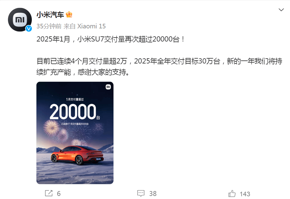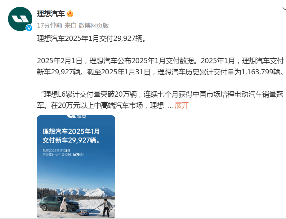 2月1日,小米汽车、理想汽车、零跑汽车等公布1月销售数据。 每日经济新闻 刘国梅 摄 据小米汽车微博,2025年1月,小米SU7交付量再次超过20000台! 目前已连续4个月交付量超2万,2025年全年交付目标30万台。小米汽车称,新的一年将持续扩充产能。 ??? 图片来源:小米汽车微博 此外,雷军1月31日在社交媒体发文称,1月新增16家门店,全国64城已有216家门店。2月计划新增5家门店,覆盖新城市:淄博。 图片来源:雷军微博 据理想汽车微博,理想汽车2025年1月交付29,927辆。截至2025年1月31日,理想汽车历史累计交付量为1,163,799辆。 “理想L6累计交付量突破20万辆,连续七个月获得中国市场增程电动汽车销量冠军。在20万元以上中高端汽车市场,理想汽车蝉联中国品牌汽车销量冠军。1月,我们向用户推送了今年首个大版本软件更新 OTA7.0,全新的基于800万Clips训练模型的理想 AD Max V13.0 ,正在全国各地挑战零接管的智能驾驶体验。 春节是阖家团圆的时刻,理想同学App近期上线了一系列有年味儿的贴心功能,如‘春节贺卡绘制’,用户可以轻松定制独一无二的电子贺卡,给家人传递新春祝福;‘春节好货’,帮助用户挑选春节好物;‘春节问答’,为用户科普春节传统文化等,为用户和家人创造更多幸福时光。感谢超百万个用户家庭、合作伙伴、我们的员工和家人以及产业同仁,祝大家新春快乐,蛇年收获更大的幸福。”理想汽车董事长兼CEO李想说。 截至2025年1月31日,理想汽车在全国已有500家零售中心,覆盖150个城市;售后维修中心及授权钣喷中心486家,覆盖225个城市。理想汽车在全国已投入使用1845座理想超充站,拥有9820个充电桩。 图片来源:理想汽车微博 据零跑汽车官方微博,零跑汽车宣布,2025年1月单月交付量25170台,同比增长105%。 图片来源:零跑汽车微博 据小鹏汽车官方微博,数据显示,2025年1月共交付新车30350台,同比增长268%。小鹏汽车已连续3个月交付量破30000台,小鹏MONAM03连续2个月交付超15000台,小鹏P7+上市2个月,累计交付迅速突破20000台。 图片来源:小鹏汽车微博 每日经济新闻综合公开资料 (责任编辑:王治强 HF013)