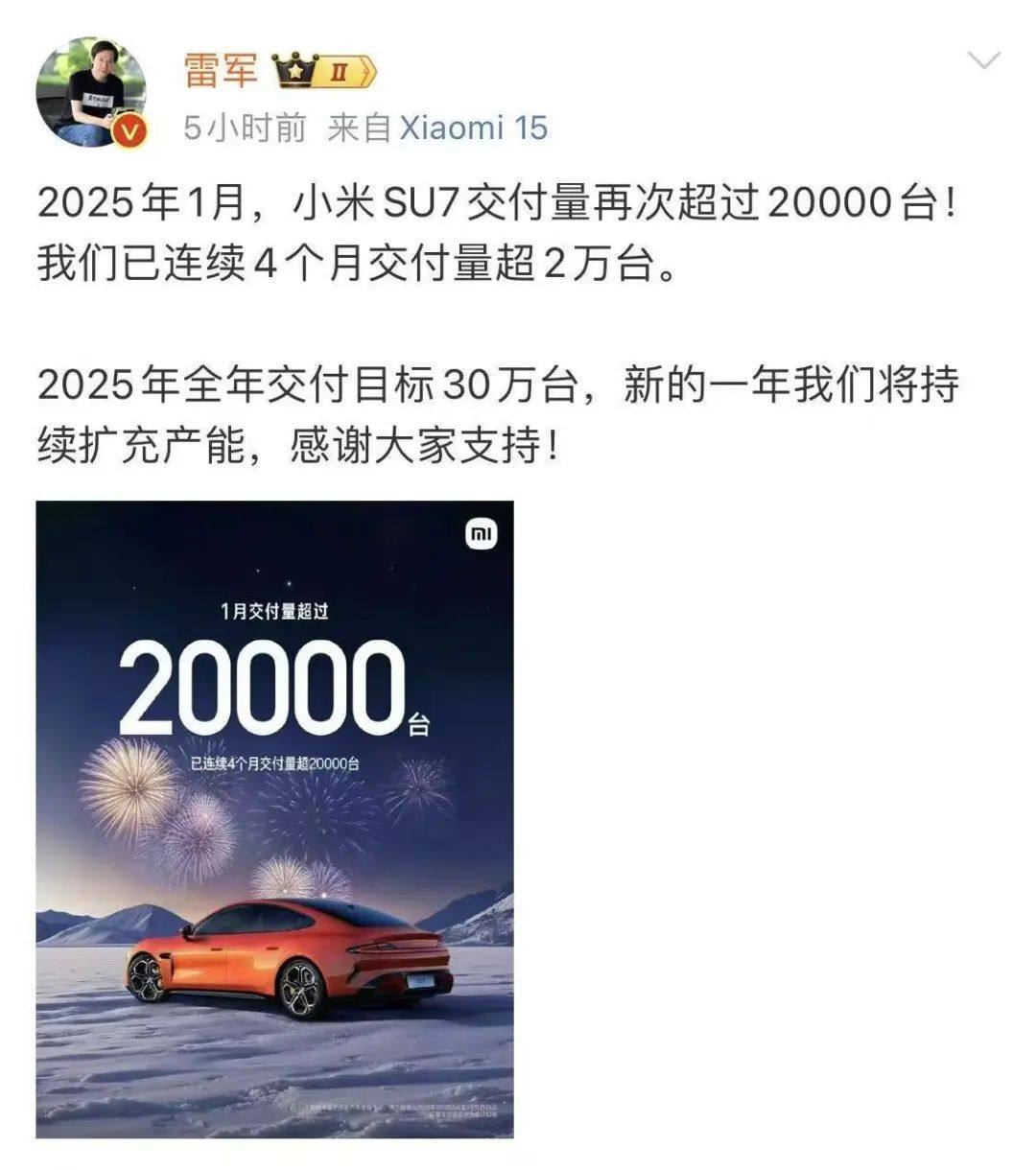 多家新能源车企公布了最新交付量。 小米汽车单月交付量超20000台 小米汽车宣布,2025年1月,小米SU7交付量再次超过20000台。目前已连续4个月交付量超2万,2025年全年交付目标30万台。 之前,小米汽车官方正式宣布,小米的新款SUV车型代号为YU7,或将对标特斯拉Model Y,将在今年上市。 资料显示,小米第二款车型、首款SUV车型 ―― YU7,定位于中大型SUV。2024年12月9日,小米YU7通过工信部认证。 该车动力系统采用前后双电机设计,均来自苏州汇川联合动力系统股份有限公司,功率分别为220千瓦和288千瓦,总功率高达508千瓦,高于零百加速2秒级的小米SU7 Max。 小鹏、蔚来交付量大增 此外,多家车企公布了2025年1月的交付量数据,其中,?2025年1月,小鹏汽车共交付新车30350台,同比增长268%。 蔚来官微显示,2025年1月,蔚来公司交付新车13,863台,同比增长37.9%。其中,蔚来品牌交付新车7951台;乐道品牌交付新车5,912台。截至目前,蔚来公司已累计交付新车685427台。其中,蔚来品牌累计交付新车658,754台;乐道品牌累计交付新车26673台。 蔚来还表示,截至2025年1月31日,蔚来的换电站数量已经达到3106座,其中高速公路换电站达到964座。自1月23日起,蔚来换电站单日换电连续5天超过10万次,预计春节期间单量将继续创造新高。 此外,零跑汽车公布1月交付量,2025年1月,零跑汽车单月交付量25170台,同比增长105%。 (责任编辑:郭健东 )