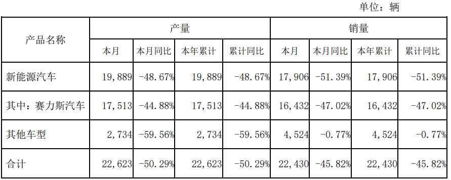 2月4日,赛力斯披露2025年1月份产销快报。报告显示,1月份赛力斯新能源汽车销量为1.79万辆,同比下降51.39%,其中赛力斯汽车销量为1.64万辆,同比下降47.02%。1月份,赛力斯产量为1.99万辆,同比下降48.67%,其中赛 ...