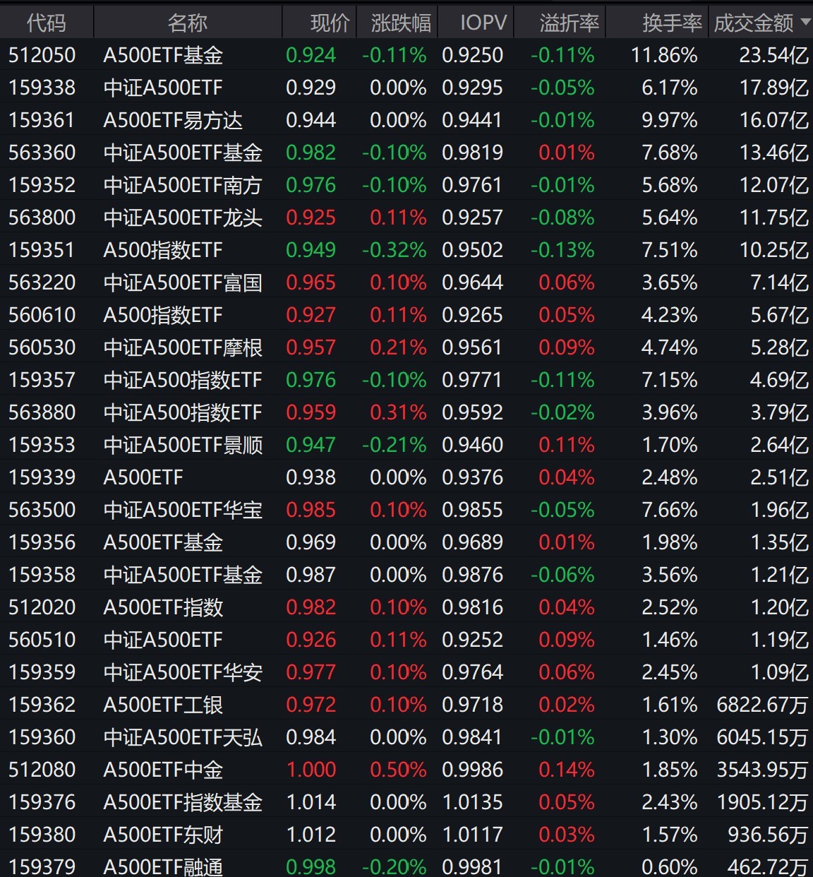 每经记者 叶峰 每经编辑 肖芮冬 市场早盘震荡分化,科创50指数领涨。中证A500指数上涨0.07%,成分股中卫宁健康、光线传媒大涨20%,天孚通信、胜宏科技、新易盛跌超16%。 截至上午收盘,场内26只跟踪中证A500指数的ETF涨跌互现,其中有7只ETF成交额超10亿元,其中A500ETF基金、中证A500ETF早盘成交额分别为23.54亿元和17.89亿元。 有券商表示,春节后A股资金回流等多重因素有望推动跨年行情迎接主升段,结构上AI+仍是核心主线,DeepSeek的突破将继续推动中国AI+及新质产业信心重估。 |