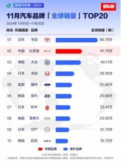 2024年,易车公布的全球汽车品牌销量TOP20榜单中,比亚迪在8月、11月,均斩获了第2名的战绩。