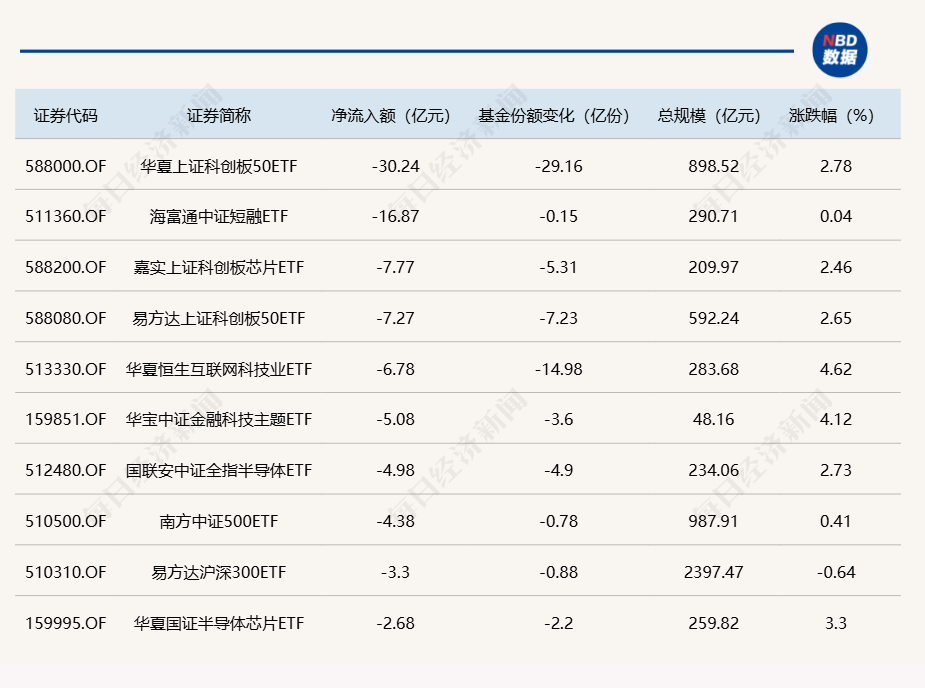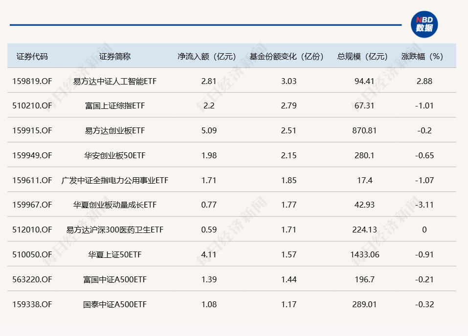 每经记者 肖芮冬 每经编辑 赵云 昨日市场全天高开后震荡回落持续分化,沪指领跌,科创50指数涨近3%。板块方面,DeepSeek概念、算力租赁、计算机、半导体等板块涨幅居前,CPO、休闲食品、民航、港口等板块跌幅居前。全市场超3400家个股上涨,超100家个股涨超10%。沪深两市全天成交额1.29万亿元,较上个交易日放量1717亿。 Wind数据显示,在2月5日的非货币ETF市场中,易方达中证人工智能ETF基金份额增加3.03亿份,净流入额为2.81亿元;富国上证综指ETF基金份额增加2.79亿份,净流入额为2.2亿元;易方达创业板ETF基金份额增加2.51亿份,净流入额为5.09亿元。 与此同时,华夏上证科创板50ETF基金份额减少29.16亿份,净流出额为30.24亿元;海富通中证短融ETF基金份额减少0.15亿份,净流出额为16.87亿元;嘉实上证科创板芯片ETF基金份额减少5.31亿份,净流出额为7.77亿元。 此外,上周五场内26只中证A500ETF合计净流出1.57亿元,其中有7只获得资金增持。 总体看来,Wind数据显示,2月5日全市场ETF份额为26743.07亿份;总规模为37204.85亿元。 |