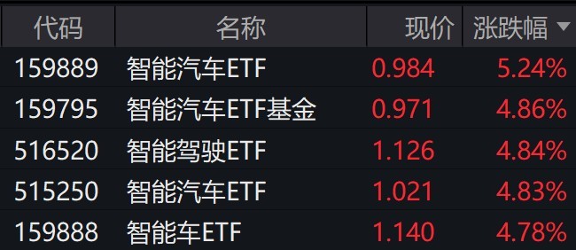 每经记者 叶峰 每经编辑 肖芮冬 智能汽车概念股午后进一步走强,拓普集团涨超9%,德赛西威涨超5%,欧菲光、北京君正涨超4%。 受盘面影响,跟踪中证智能汽车主题指数的ETF涨逾4%。 中证智能汽车主 ...