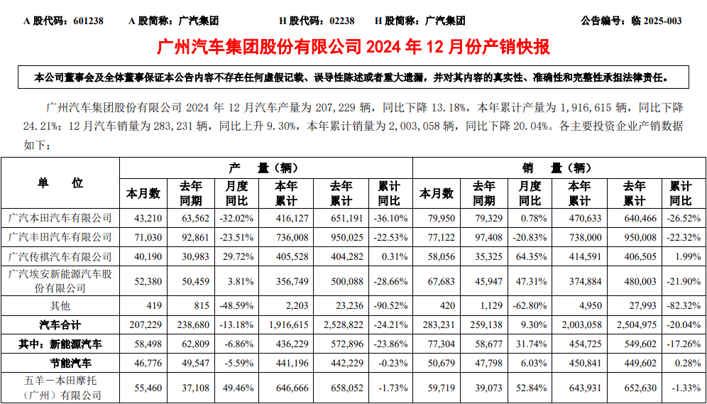 蛇年伊始,广汽集团交棒靴子落地。 根据广汽集团2月4日发布的公告,公司第六届董事会第80次会议于2025年2月3日(星期一)以通讯方式召开。会议审议通过了《关于选举公司董事长的议案》。曾庆洪由于到龄退休,已辞去公司第六届董事会董事长、董事及董事会战略委员会主任委员、委员职务。会议选举公司董事冯兴亚为公司第六届董事会董事长。 当前,广汽集团正处于转型关键期。在2024年年底的广州车展上,冯兴亚发布广汽三年“番禺行动”计划,提出通过四大改革举措,五大保障,到2027年自主品牌占集团总销量超60%,挑战200万辆的目标。 彼时,时任广汽集团总经理的冯兴亚在广州车展接受采访时坦言:“2024年,我们面临着竞争的压力,但没有这些竞争的压力,也没有今天的改革。广汽不能等,并下决心开始行动,发布了广汽三年‘番禺行动’,这就是应对大势和经营状况所做出的全面、彻底的改革。” 他在阐释广汽集团总部搬迁至番禺时称,“集团要搬到研产供销的一线,让听到炮火的人来决策。” 当下车圈鏖战正酣,“炮火声”激烈,冯兴亚能否带领广汽集团闯出新天地? 图片来源:广汽集团 广汽完成掌门人交接 一直以来,广汽集团换届广受外界关注,去年年底就有消息传出冯兴亚将接替曾庆洪。 自2016年10月开始,曾庆洪担任广汽集团董事长。去年10月,广汽集团换届延期。2024年9月30日,广汽集团发布公告称,公司第六届董事会、监事会将于2024年10月8日任期届满,鉴于公司新一届董事会、监事会的换届工作正在筹备过程中,为保证公司董事会、监事会工作的连续性,公司第六届董事会、监事会的换届选举将适当延期进行。 根据广汽集团2月4日发布的公告,公司第六届董事会第80次会议于2025年2月3日(星期一)以通讯方式召开。会议审议通过了《关于选举公司董事长的议案》。曾庆洪由于到龄退休,已辞去公司第六届董事会董事长、董事及董事会战略委员会主任委员、委员职务。会议选举公司董事冯兴亚为公司第六届董事会董事长。 广汽掌门人顺利完成交棒,到龄退休的曾庆洪是一名“广汽老将”。 根据资料,1978年底,18岁的曾庆洪从广州公安知青农场进入广州客车修理厂,成为了一名汽车修理工。曾庆洪历任广州客车厂汽车修理工、工艺科组长、副科长、技术中心主任、综合部部长、总经理助理、副总经理、常务副总经理、副董事长。从2016年至2025年1月担任广汽集团党委书记、董事长。 曾庆洪坚持自主研发和发展自主品牌,2005年“两会”期间,作为全国人大代表的曾庆洪彼时对媒体表示,“中国汽车业必须搞自主品牌。” 2006,广汽研究院成立;2007年,广汽集团开始推进自主品牌项目建设,并于2008年成立广汽乘用车,把通过和本田、丰田的合资合作积累的资金、技术、人才等各种资源输入到自主品牌广汽传祺之中。2010年,广汽传祺成功推出,曾连续6年以年均复合增长率85%以上的速度位居中国品牌增速第一。 2017年,新能源品牌广汽埃安成立,2023年销量达到48万辆,用时4年零8个月实现累计产销百万。 接棒上任的冯兴亚同样是一名广汽老将。曾庆洪上任广汽集团董事长同年,冯兴亚年正式担任广汽集团总经理。过去,冯兴亚作为广汽集团二号位,与曾庆洪搭档长达9年。 在“曾冯组合”共同掌舵广汽集团的第一年,广汽集团销量增幅就位居国内六大国有汽车集团之首,其在2016年销售165万辆,同比增长27%,销量增幅高于行业平均水平12个百分点。这一年,广汽集团营收达到494.18亿元,同比增长67.99%。 在2017年,广汽集团销量首次突破200万辆,此后广汽集团年销量始终维持在200万辆以上。2023年,广汽集团销量突破250万辆。 值得一提的是,曾冯组合带动广汽进入“千亿广汽”时代。2022年、2023年,广汽集团营收均突破千亿元。 “我们无法改变外部环境,但可以改变自身” 不过,在智电化浪潮之下,广汽集团转型正面临考验。2023年,广汽集团净利润仅为44.29亿元,同比下滑45%,近乎腰斩。根据广汽集团1月发布的2024年年度业绩预告公告,公司预计2024年度实现净利润为8亿元到12亿元,与上年同期相比将减少32.29亿元到36.29亿元,同比减少72.91%到81.94%。 图片来源:广汽集团产销快报截图 广汽集团解释业绩变动的主要原因之一是:受汽车行业价格内卷、竞争格局剧变等因素影响,汽车销量减少;同时为应对市场竞争,公司及投资企业追加销售补贴等商务政策的投入约 180 亿元,综合导致本报告期归属于母公司所有者净利润同比下降。 值得一提的是,在2024年的广州车展上,广汽集团正式官宣番禺行动,目标2027年自主品牌占集团总销量超60%,挑战200万辆。 广汽集团方面2月4日向时代财经表示:“(番禺行动)启动三个月以来,广汽集团已稳步推进多项重大改革工作,包括将集团总部搬迁到番禺汽车城,整合自主品牌板块的产品、采购、财务和营销领域,成立产品本部、采购本部、财务本部和包含传祺营销本部、埃安营销本部、昊铂营销本部在内的品牌营销本部,启动IPD及数字化变革、全面实施干部竞聘上岗等,持续推进全要素向一线实务集中、构建一体化组织保障。” 冯兴亚曾在广州车展的采访中阐释广汽集团总部搬迁至番禺的原因:“集团要搬到研产供销的一线,让听到炮火的人来决策。” 他还认为,面对汽车行业的种种变化,汽车集团的整体工作重心与管理模式亟需根本性调整。以广汽为例,过