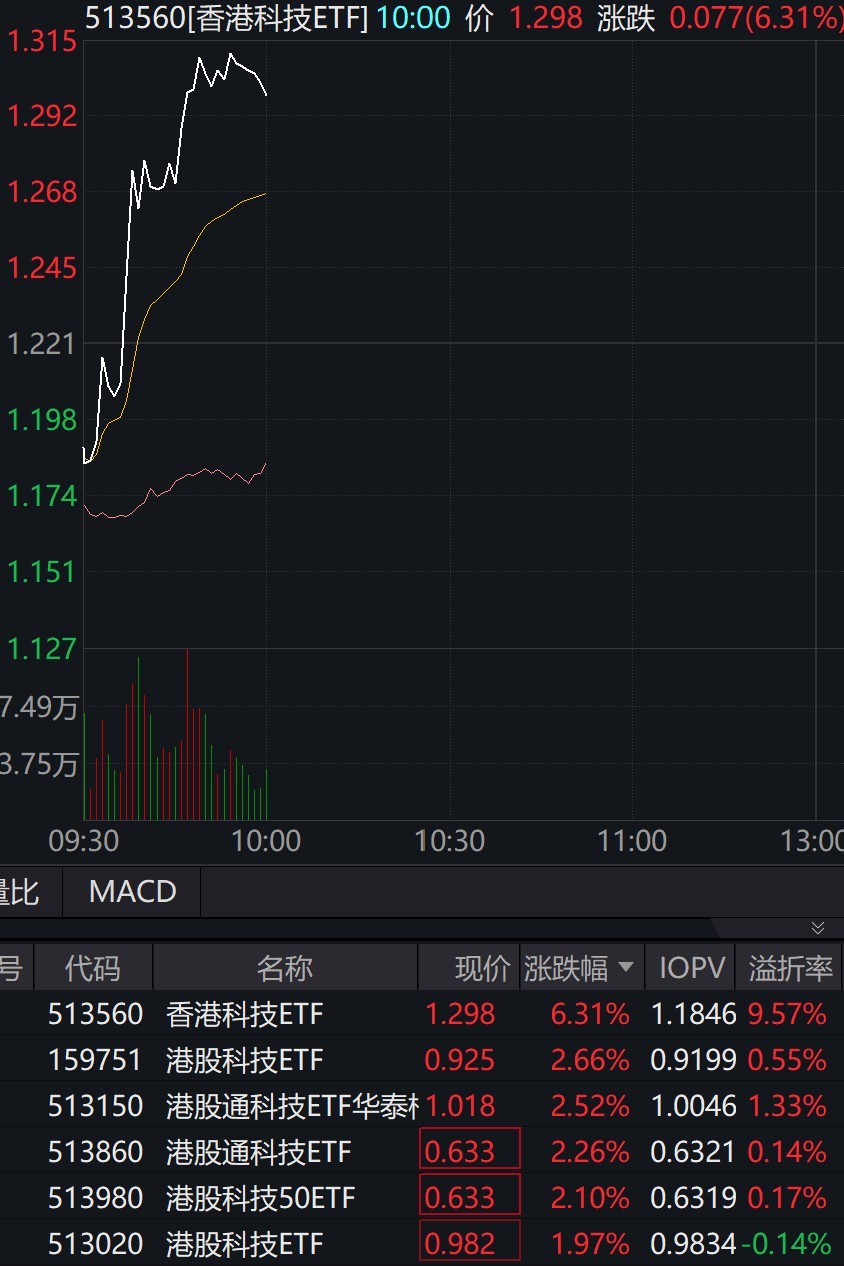 每经记者 叶峰 每经编辑 肖芮冬 港股早盘持续走强,跟踪中证港股通科技指数的香港科技ETF涨超6%,溢价近10%。 目前场内有6只ETF跟踪中证港股通科技指数,其余涨幅约2%。 中证港股通科技指数从港 ...