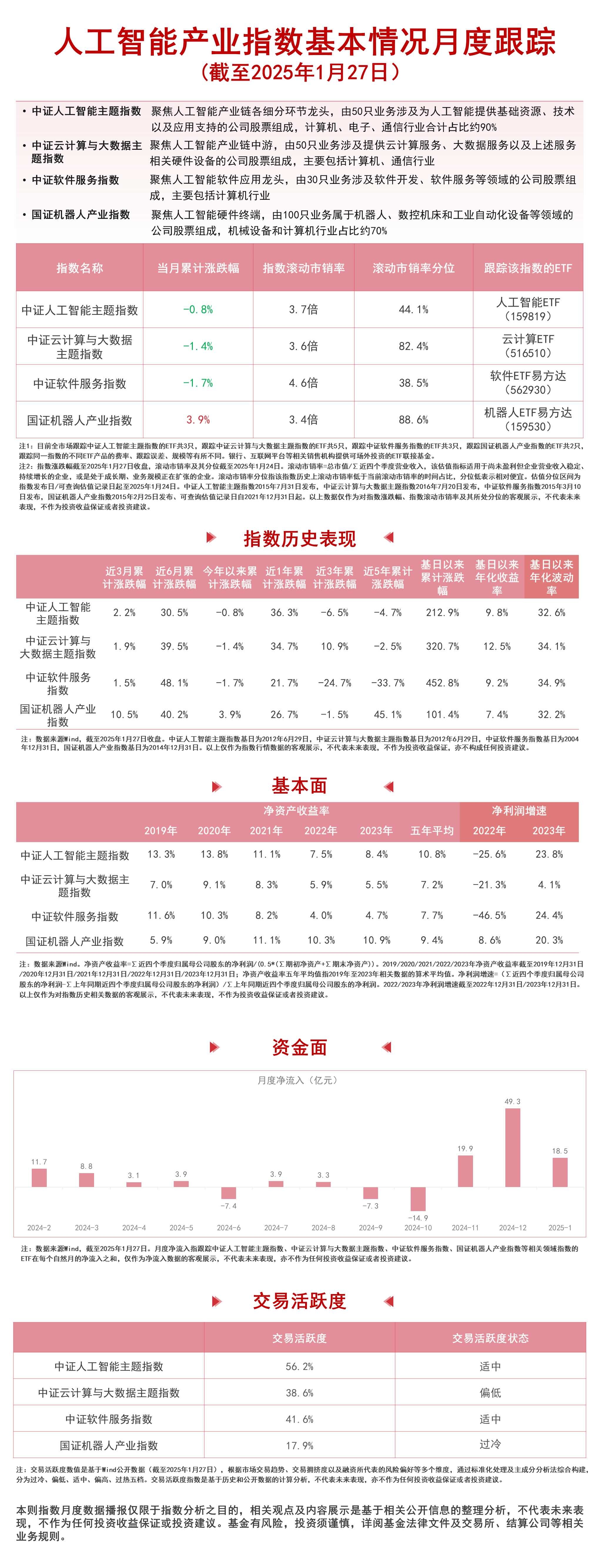 1月,国证机器人产业指数上涨3.9%,中证人工智能主题指数下跌0.8%,中证云计算与大数据主题指数下跌1.4%,中证软件服务指数下跌1.7%。 截至1月31日,DeepSeek应用上线仅21天,日活规模突破2000万,成为全球增速最快 ...
