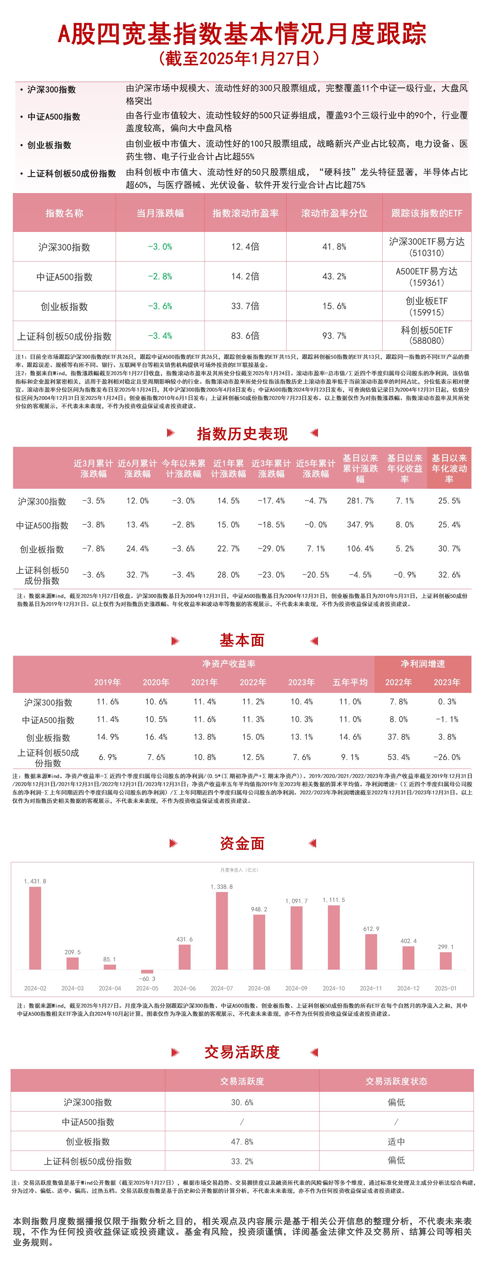 1月,沪深300指数下跌3.0%,中证A500指数下跌2.8%,创业板指数下跌3.6%,上证科创板50成份指数下跌3.4%,资金连续八个月净流入跟踪以上指数的ETF产品。 |