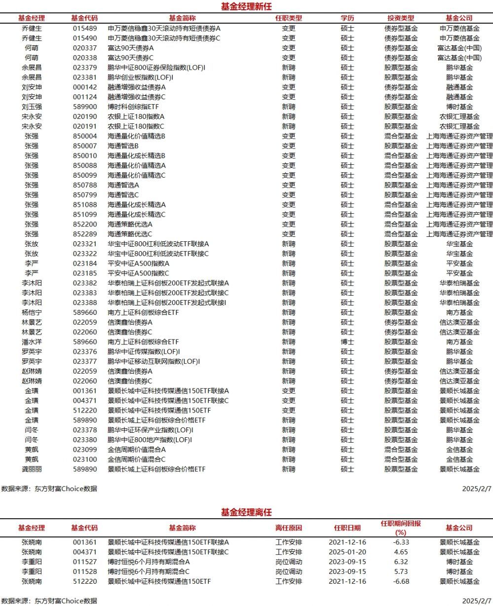 每经AI快讯,据东方财富Choice数据统计,今日新聘基金经理19人,涉及42只基金(A/C类分开计算),主要来自上海海通证券资产管理、鹏华基金等公司。另外,今日有2位基金经理离任。 ...