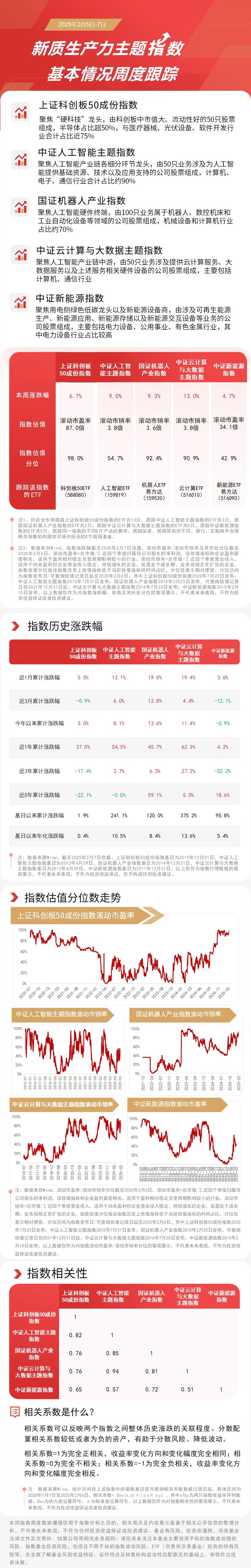 本周,DeepSeek概念领涨市场,新质生产力主题指数集体走强,中证云计算与大数据主题指数上涨13.0%,国证机器人产业指数上涨9.3%,中证人工智能主题指数上涨9.0%,上证科创板50成份指数上涨6.7%,中证新能源指数上涨4.7%。 |