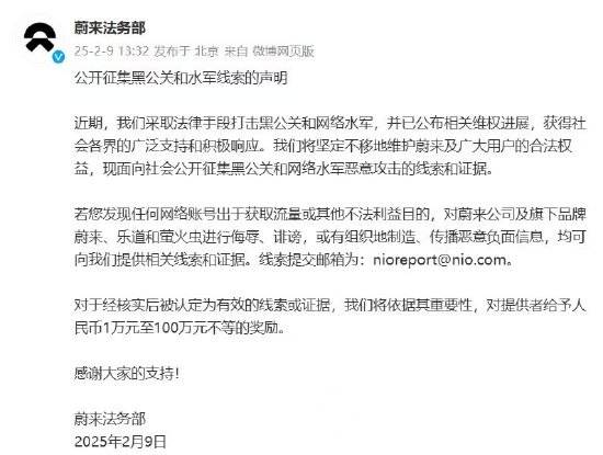 同辰科技讯 2月9日下午消息,蔚来法务部发布公告,宣布将以最高 100 万元的奖励金额,面向社会公开征集黑公关和网络水军恶意攻击的线索和证据。 公告称,长期以来,蔚来公司及旗下品牌蔚来、乐道和萤火虫一直是黑公关和网络水军恶意攻击的目标。部分网络账号出于获取流量或其他不法利益目的,对蔚来公司及旗下品牌进行侮辱、诽谤,或有组织地制造、传播恶意负面信息。 蔚来坚决采取法律手段维护自身及及广大用户的合法权益。此前,“车事纪”“小牛说车”“森哥电车” 等账号因违法侵权被制裁。公安机关对编造传播合肥工厂爆炸、散布蔚来破产谣言、制作虚假车辆爆炸视频的人员依法采取强制措施,还侦破多起恶意攻击蔚来信息系统案件,涉案人员被追究刑责。蔚来还对一批侵权账号持有人提起诉讼并公布相关情况。 蔚来称将始终坚守积极向上的价值观,对于黑公关与网络水军的恶意行径,坚决予以抵制,绝不姑息。同时,蔚来呼吁广大用户和社会公众共同抵制黑公关和网络水军的不良行为,携手营造健康的网络环境和市场秩序。