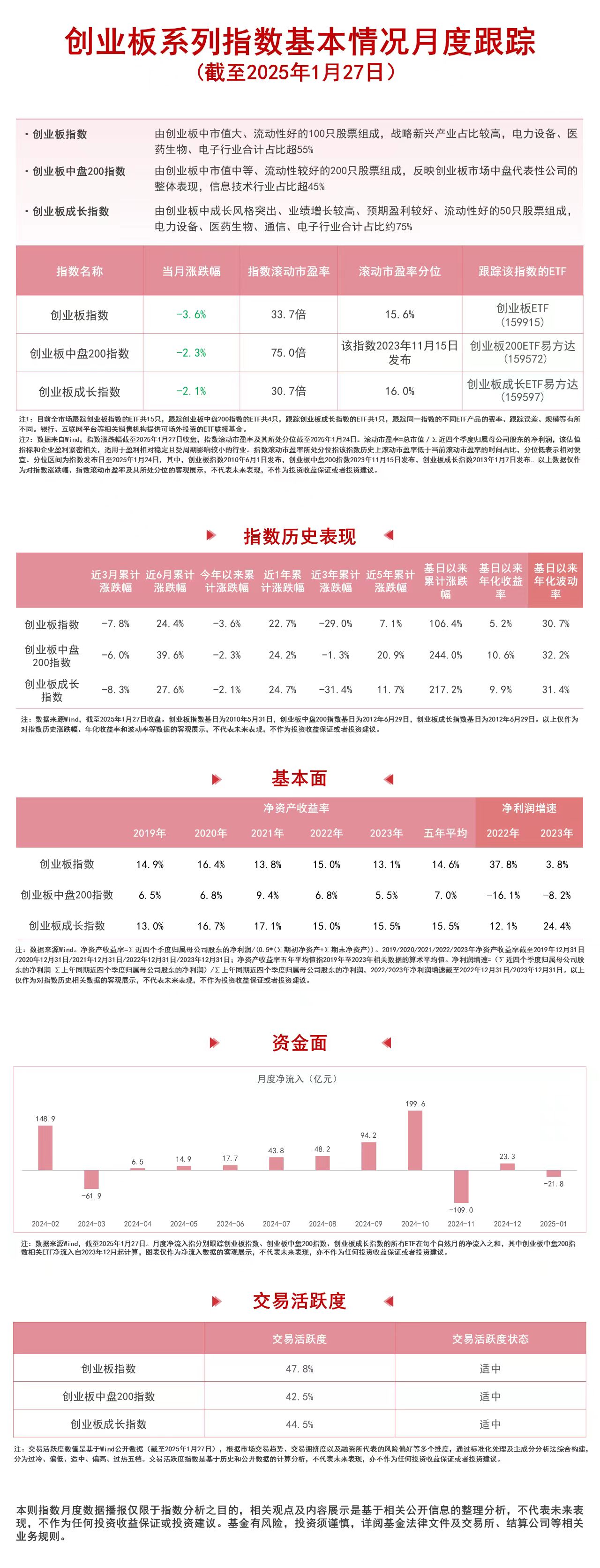 1月,创业板成长指数下跌2.1%,创业板中盘200指数下跌2.3%,创业板指数下跌3.6%。 海通证券表示,中期稳增长政策推动基本面回暖,市场趋势有望向上,基本面更优的科技和中高端制造或推动成长回归。 ...