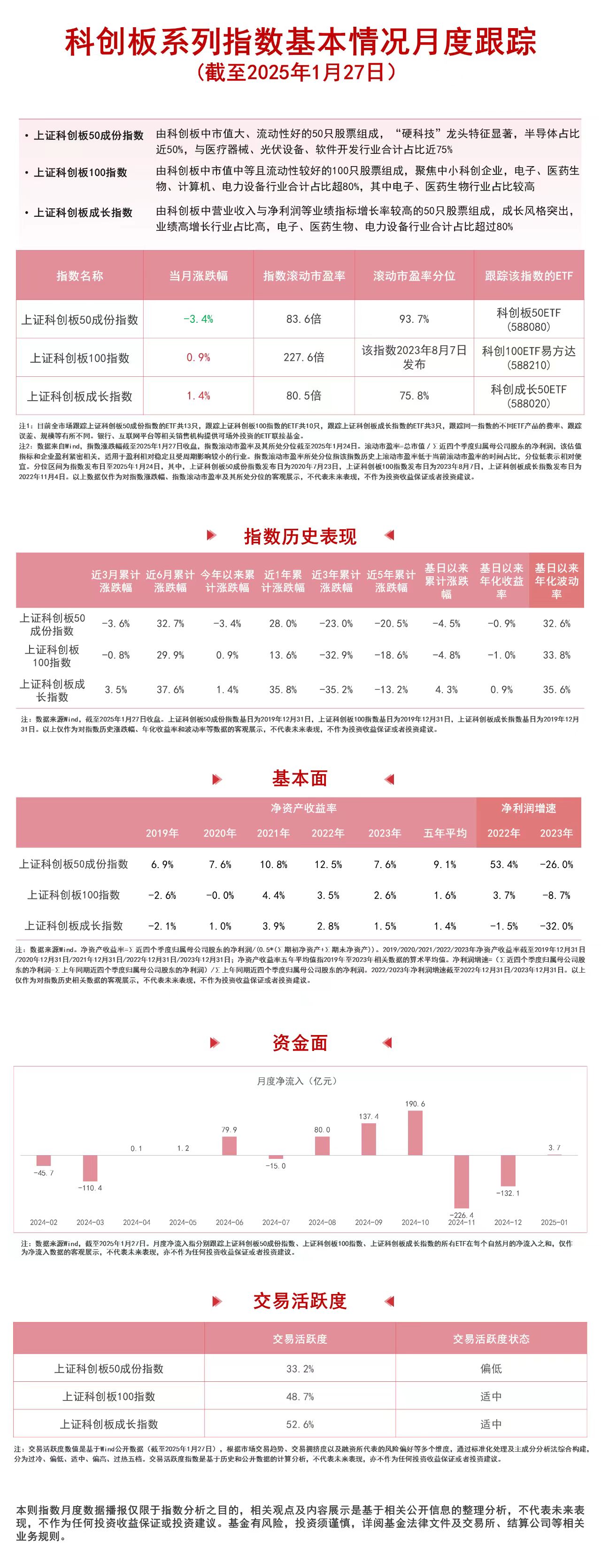 1月,科创板系列指数涨跌不一,上证科创板成长指数上涨1.4%,科创100指数上涨0.9%,上证科创板50成分指数下跌3.4%。