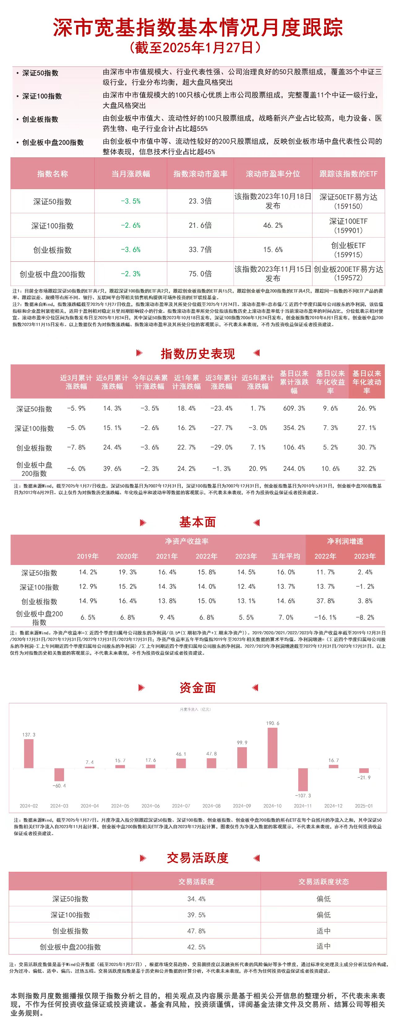 1月深市震荡调整,创业板中盘200指数下跌2.3%,深证100指数下跌2.6%,深证50指数下跌3.5%,创业板指数下跌3.6%。