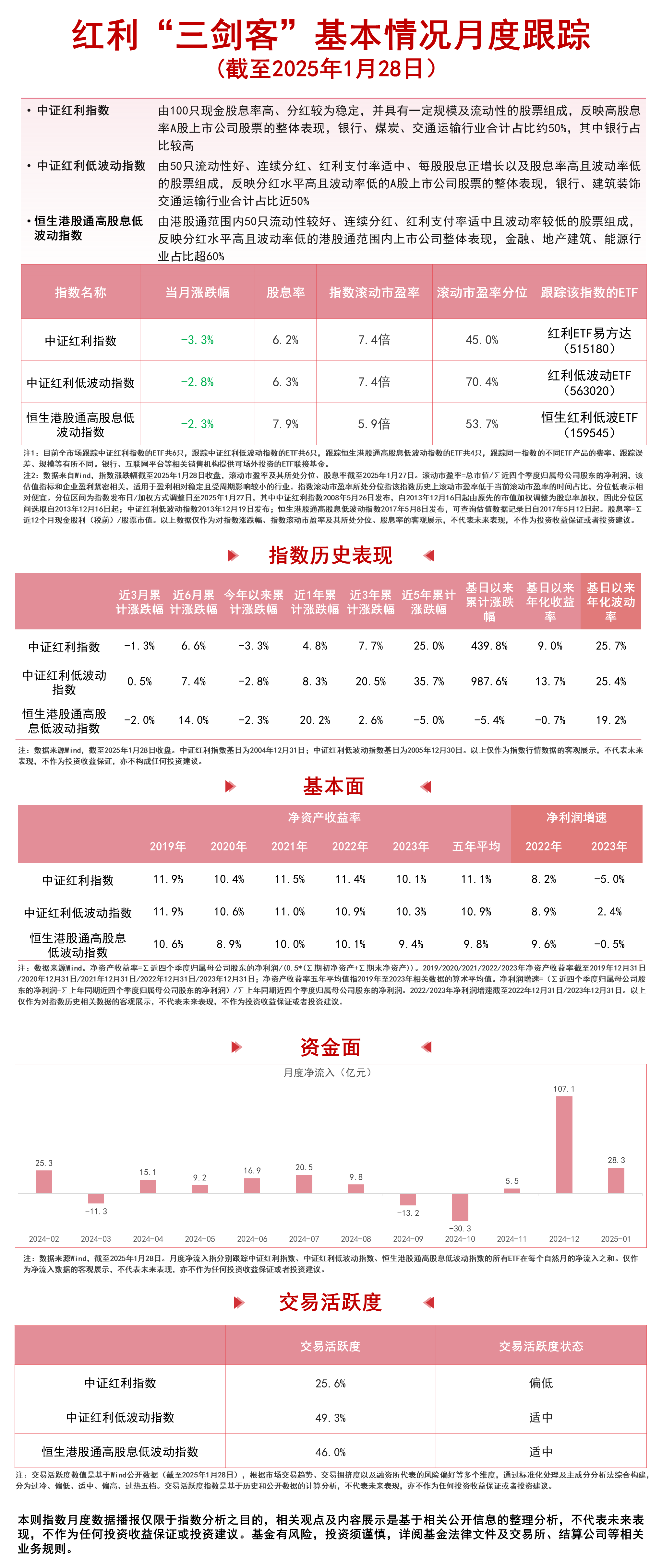 1月,中证红利指数下跌3.3%,中证红利低波动指数下跌2.8%,恒生港股通高股息低波动指数下跌2.3%,资金连续三个月净流入跟踪以上指数的ETF产品,合计净流入额达141亿元。 ...