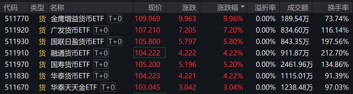 每经记者 叶峰 每经编辑 肖芮冬 多只货币型ETF午后异动拉升,金鹰增益货币ETF涨停,广发货币ETF涨超7%。 值得注意的是,上述货币型ETF成交额普遍不高,但多只换手率超100%。 有分析人士表示,货币基金不像股票基金有弹性,货币基金主要在于获取稳健的收益,目前的年化收益大多不超过2%,一旦追高买入出现大幅亏损,在相当长的时间内很难从收益中获得弥补。