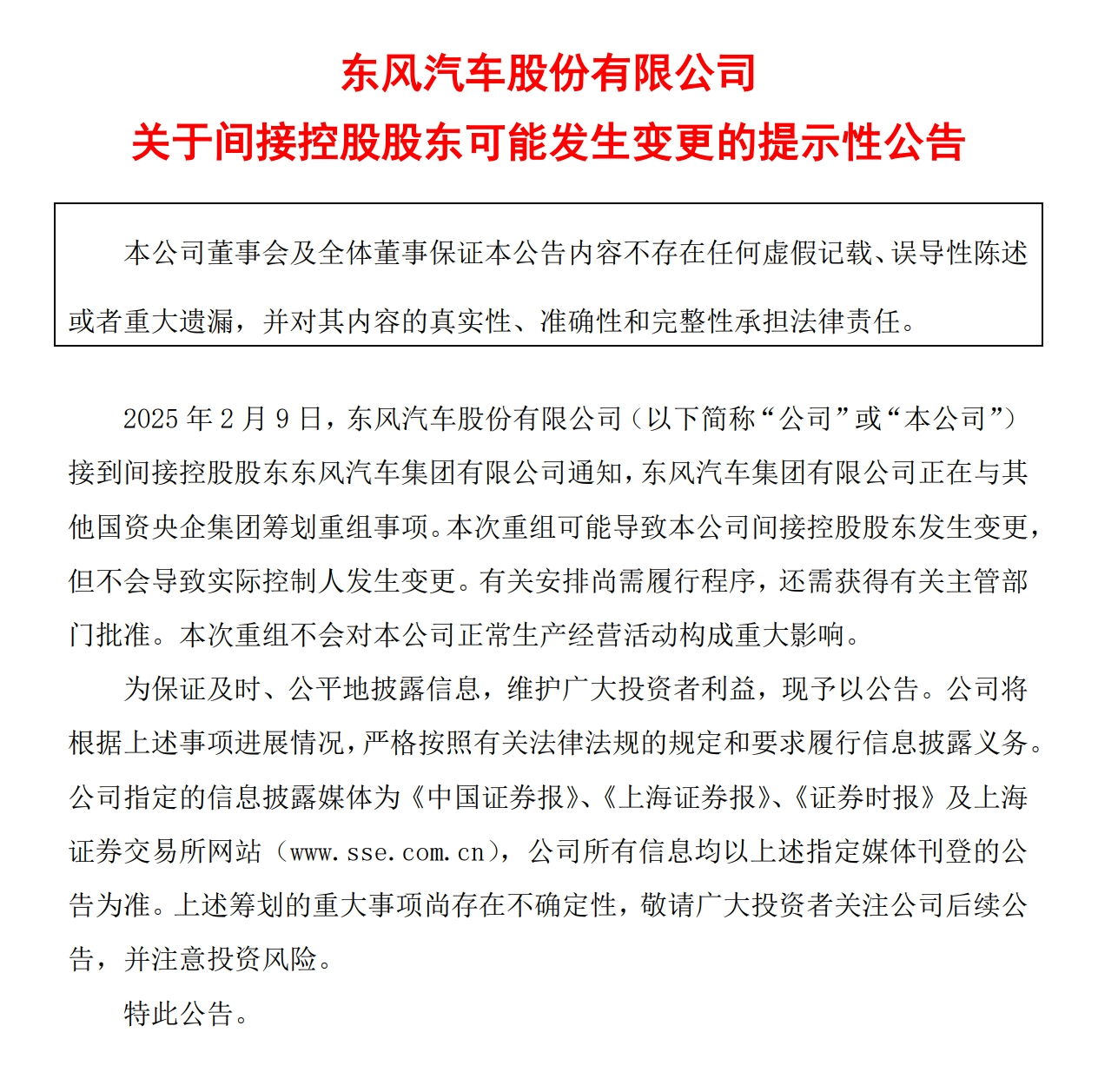 2月9日,东风汽车股份有限公司(以下简称“东风股份”)和东风电子科技股份有限公司(以下简称“东风科技”)均发布了关于间接控股股东可能发生变更的公告。同日,长安汽车也发布了类似公告,称其间接控股股东兵器装备集团正在与其他国资央企集团筹划重组事项。 图片来源:东风股份公告截图 对此,有观点认为,东风集团和长安汽车或将联合重组。《每日经济新闻》记者向东风集团相关负责人询问,对方回应称:“以目前公告内容为准,目前尚处于筹划阶段。” 具体来看,东风股份在公告中称,东风股份于2月9日接到间接控股股东东风汽车集团有限公司(以下简称“东风集团”)通知,东风集团正在与其他国资央企集团筹划重组事项。本次重组可能导致东风股份的间接控股股东发生变更,但不会导致实际控制人发生变更。相关安排尚需履行程序,并需获得有关主管部门批准。本次重组不会对公司的正常生产经营活动构成重大影响。 东风科技公告称,东风科技于2月9日接到间接控股股东东风集团通知,东风集团正在与其他国资央企集团筹划重组事项。本次重组可能导致东风科技的间接控股股东发生变更,但不会导致实际控制人发生变更。有关安排尚需履行程序,并需获得有关主管部门批准。本次重组不会对公司的正常生产经营活动构成重大影响。 同日,长安汽车也发布类似公告称,2月9日,重庆长安汽车股份有限公司(以下简称“长安汽车”)接到间接控股股东中国兵器装备集团有限公司(以下简称“兵器装备集团”)通知,兵器装备集团正在与其他国资央企集团筹划重组事项。本次重组或将导致长安汽车控股股东发生变更,但不会导致实际控制人发生变更。有关安排尚需履行程序,还需获得有关主管部门批准。本次重组不会对长安汽车正常生产经营活动构成重大影响。 (责任编辑:徐帅 )