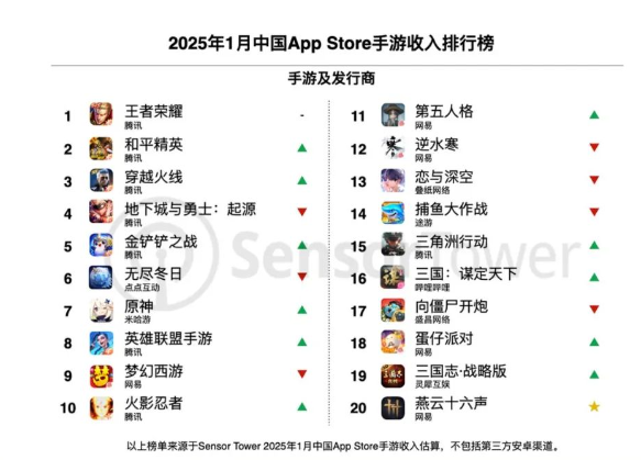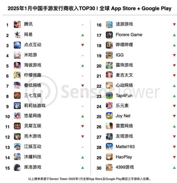 2月10日,移动应用数据分析公司Sensor Tower发布了2025年1月中国手游出海榜单,显示中国手游厂商在全球市场表现强劲。受春节假期提振,各大游戏厂商收入大幅增长。据统计,2025年1月,34个中国厂商入围全球手游发行 ...