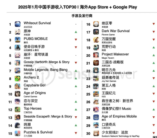每经记者 李宇彤 每经编辑 魏官红 2月10日,移动应用数据分析公司Sensor Tower公布了2025年1月中国手游的出海榜单。受到春节假期的提振,各家游戏也都迎来收入的较大幅度增长。 2月7日公布的“2025年1月中国手游发行商全球收入排行榜”显示,2025年1月,共34个中国厂商入围全球手游发行商收入榜TOP100,合计吸金23.3亿美元,占全球TOP100手游发行商收入39.2%。 2024年,受到《黑神话:悟空》等爆款游戏的影响,游戏成为外界的焦点和热点话题之一,中国手游的吸金能力也进一步提升。据Sensor Tower,2024年TOP30中国手游发行商全球吸金234亿美元,比2023年略有上涨,达到全球TOP100手游发行商收入的36%。 而2025年的第一个月,中国游戏厂商的收入增长显而易见,可谓实现“开门红”。数据显示,2024年的12月中国厂商合计吸金18.8亿美元,2025年1月则是环比增长了24%。 具体到游戏厂商,“中国手游发行商收入TOP30”中前五名的争夺战愈加白热化。1月,网易在去年12月短暂地被点点互动超越后,再度回归第二名。本期榜单的前五名则分别为腾讯、网易、点点互动、米哈游和海彼游戏。 值得注意的是,在竞争激烈的1月,这是小游戏赛道的另一位实力选手海彼游戏首次跻身前五。 图片来源:Sensor Tower截图 1月游戏厂商激战 《穿越火线》收入增长421%对于头部厂商而言,1月底的新春佳节也是各显神通的必争之时。 2025年1月仍占据榜首的腾讯收入提升62%,旗下多款游戏都有收入上的大幅增长,头部产品《王者荣耀》、《和平精英》和《穿越火线》1月全球收入分别激增94%、267%和421%。《王者荣耀》推出的多款皮肤和多个特别活动,使游戏月收入达到近42个月以来的最高值。 网易方面,《第五人格》1月全球收入涨幅高达123%,成为网易目前收入最高的手游并推动网易本期收入提升28%。 除了收入飞升的《第五人格》,1月网易正式推出的武侠题材开放世界冒险新游《燕云十六声》,也值得一提。 《燕云十六声》上线后,凭借武侠题材和开放世界的游戏形式,加上“捏脸”和剧情等内容,快速吸引大量玩家。接连实现“5天玩家突破300万”“19天注册玩家1000万”,并在1月24日达成累计玩家人数1500万的成就。游戏上线首日即登顶中国iOS手游下载榜,并连续一周稳居榜首,成为1月中国iOS手游下载第一,成为收入榜第20名。 图片来源:Sensor Tower截图 选择在春节前上线的还有沐瞳科技的《Mobile Legends:Bang Bang》。1月23日,这款MOBA游戏(多人在线战术竞技游戏)在中国正式上线,国服名称为《决胜巅峰》。1月,该游戏的全球收入也实现了76%的增长,为沐瞳科技带来40%的收入涨幅。 头部厂商的竞争之外,1月二次元游戏的热门游戏也都迎来“回春”。米哈游《原神》推出“炽烈的还魂诗”5.3新版本,也使得《原神》1月全球收入激增106%,再次成为米哈游旗下收入最高的手游,一扫2024年流水逐步下滑的疲态。 同样受到新版本带动收入的还有《鸣潮》。1月,该游戏全球收入增长近3倍,带动库洛游戏收入大幅上涨243%,重返收入榜第15名。 小游戏赛道是否能持续爆发?在出海方面,小游戏维持了2024年的强劲表现。点点互动的《Whiteout Survival》再次在“1月出海手游收入榜”摘得榜首。 1月下旬,《Whiteout Survival》在海外市场推出蛇年春节活动,推动该游戏本期海外收入环比增长10%,接近1.4亿美元,稳居出海手游收入榜冠军。根据Sensor Tower应用洞察数据,《Whiteout Survival》全球累计收入达19亿美元,预计将于今年2月中下旬突破20亿美元大关。 《每日经济新闻》记者也注意到,排在该榜单前十的游戏中,有一半都是小游戏。而在竞争格外激烈的1月,获得“2025年1月中国手游发行商全球收入排行榜”第五的海彼游戏,有两款游戏登上了出海手游收入榜的前十:《Archero 2》《Capybara Go!》,分别排在榜单的第八名和第九名。 图片来源:Sensor Tower截图 《Capybara Go!》的吸金实力已在2024年年底得到了印证,2024年11月,该游戏登顶出海手游收入增长榜,还一举拿下出海手游收入榜第9名。Sensor Tower数据显示,截至2024年12月11日,该游戏海外内购收入达4000万美元。 DataEye研究院负责人刘尊也曾在接受《每日经济新闻》记者采访时提到这款游戏,他认为,彼时火热的“卡皮巴拉”就是佛系、情绪稳定等因素。而此类提供情绪价值的游戏,2025年在面向年轻玩家时还会大放异彩。 1月上旬,海彼游戏Roguelike动作射击手游《Archero 2》在美国、欧洲和日本等更多海外市场上线。游戏快速稳居美国App Store手游下载榜亚军,和日本、法国、西班牙等市场App Store手游下载榜冠军,本期海外收入增长64%,排名提升9位,挺进收入榜第8名。在下载量方面,《Archero 2》1月下载量增长345%,首次达到下载榜第7名。 可以看出,小游戏赛道的题材逐步丰富,游戏内容和玩法也在不断拓展。目前能在中国手游收入和出海上占领一席之地的游戏,都带有鲜明的特色。而2025年小游戏赛道是否还能继续进化,还需要游戏厂商们不断从题材和游戏玩法、游戏内容上实现创新。 封面图片来源:视觉中国-VCG41N1182684923 |