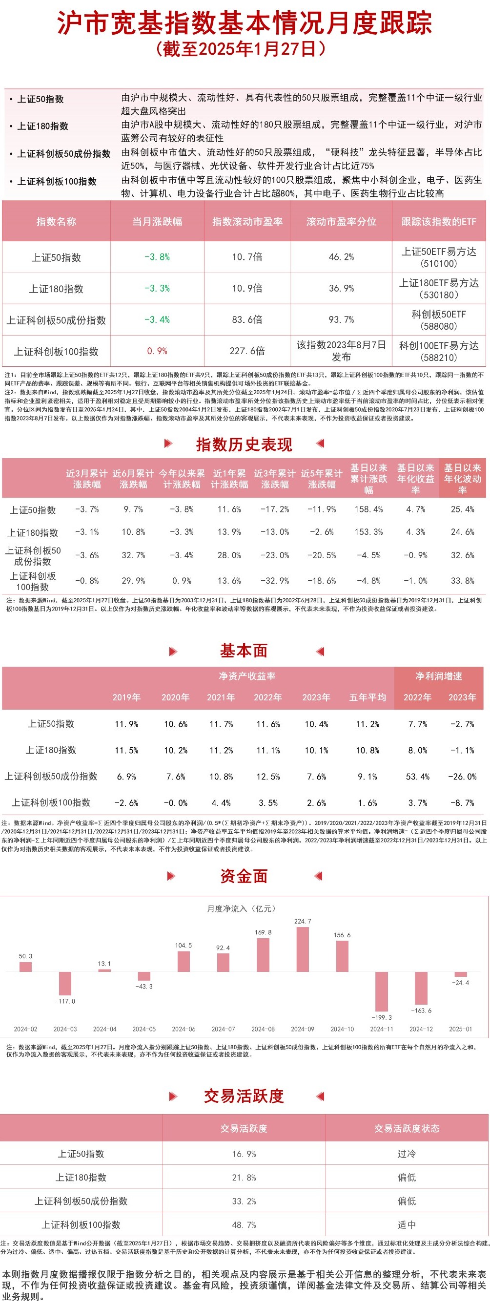 1月,科创100指数上涨0.9%,上证180指数下跌3.3%,上证科创板50成份指数下跌3.4%,上证50指数下跌3.8%。 529家沪市公司1月份发布2024年业绩预喜公告, 其中248家预增、112家扭亏、169家减亏。 ...