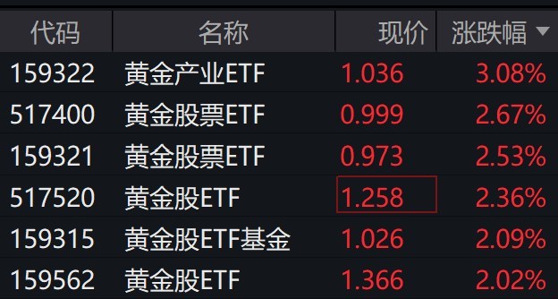 每经记者 叶峰 每经编辑 肖芮冬 黄金股震荡走强,赤峰黄金涨超5%,山金国际涨超4%,紫金矿业、湖南黄金涨超3%。 受盘面影响,跟踪中证沪深港黄金产业股票指数的ETF涨超2%。 中证沪深港黄金产业股 ...