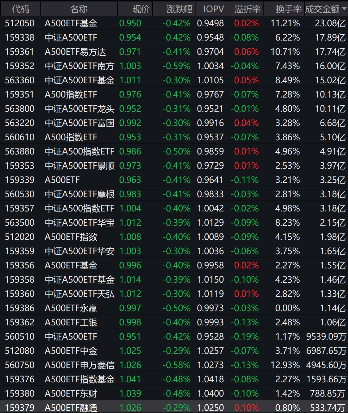 每经记者 叶峰 每经编辑 肖芮冬 市场早盘震荡调整,创业板指领跌。中证A500指数下跌0.4%,成分股中光线传媒涨超14%,航锦科技涨停。 截至上午收盘,场内28只跟踪中证A500指数的ETF普跌约0.4%,其 ...
