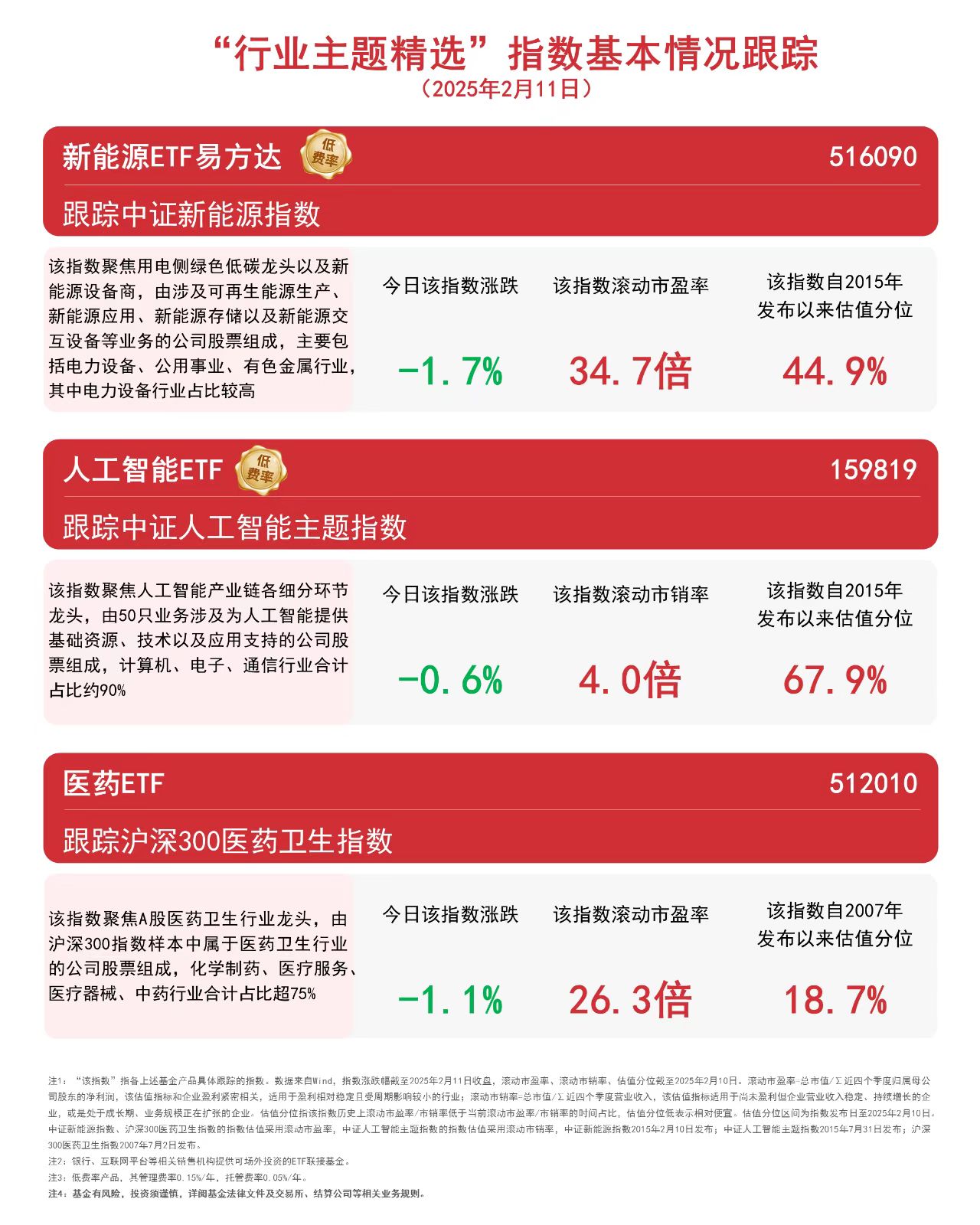 截至收盘,中证人工智能主题指数下跌0.6%,沪深300医药卫生指数下跌1.1%,中证新能源指数下跌1.7%。