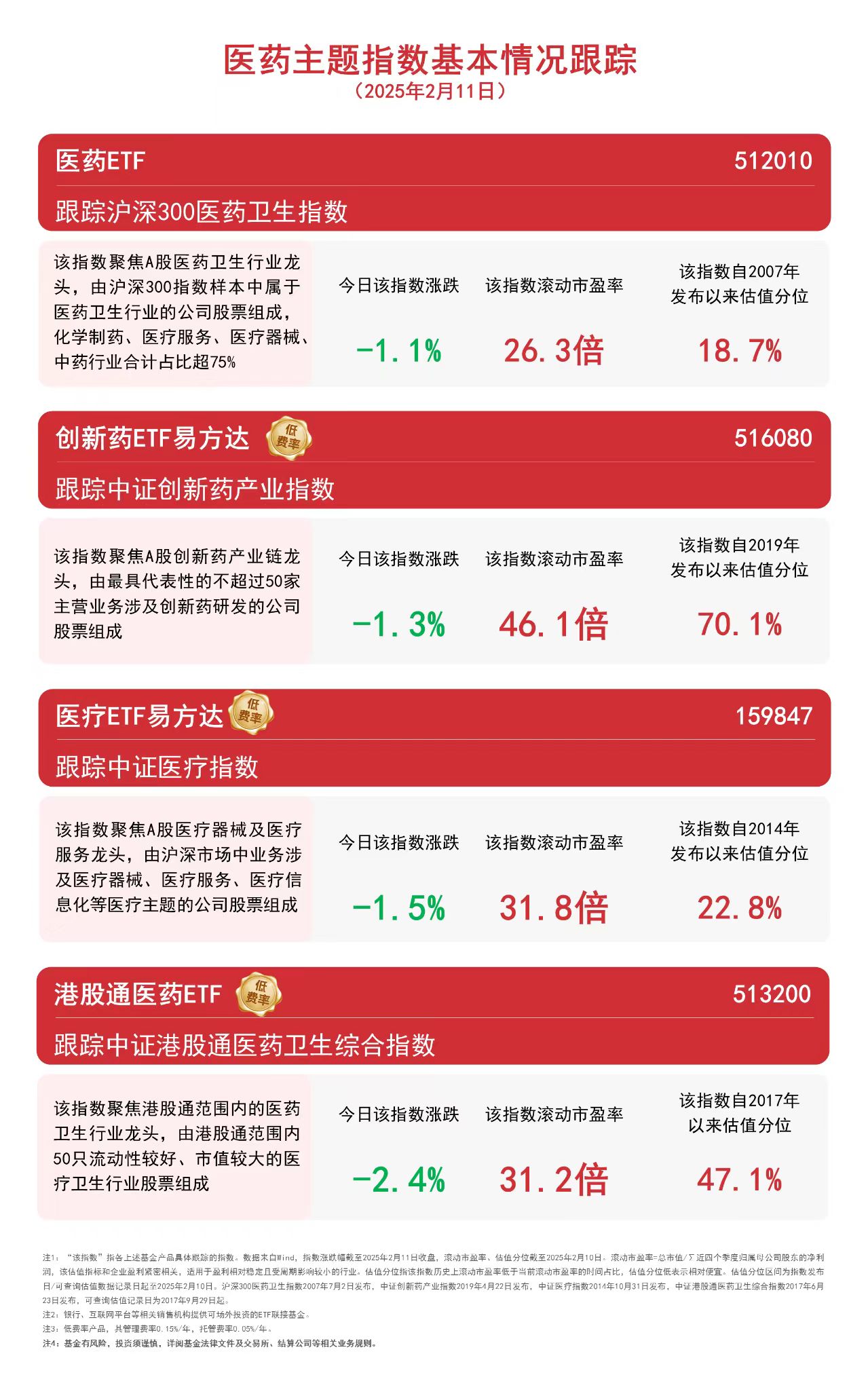 医药主题指数今日集体调整,截至收盘,沪深300医药卫生指数下跌1.1%,中证创新药产业指数下跌1.3%,中证医疗指数下跌1.5%,中证港股通医药卫生综合指数下跌2.4%。 |