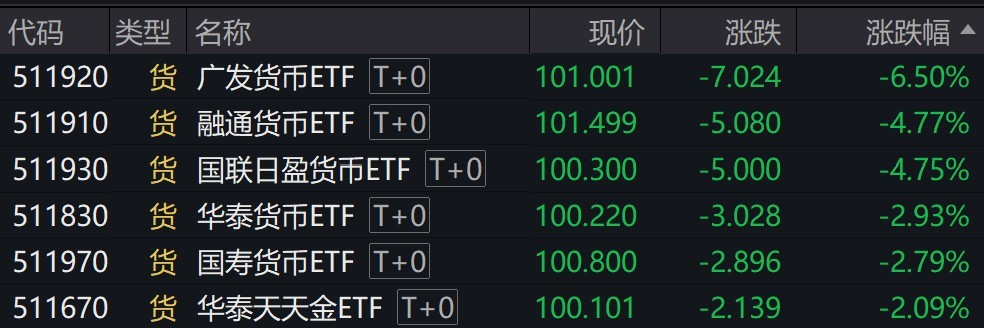 每经记者 叶峰 每经编辑 肖芮冬 昨日因出现大幅溢价而停牌的货币型ETF,今日早盘大幅回落。广发货币ETF跌逾6%,融通货币ETF、国联日盈货币ETF跌逾4%。 2月11日中午,上交所公告,根据基金公司申请,华泰货币ETF、华泰天天金ETF等7只货币ETF产品自盘中即时起至收市暂停交易业务。 根据基金公司发布的公告,停牌原因在于这些产品二级市场的交易价格出现较大幅度溢价,交易价格明显偏离基金份额参考净值,为保护投资者利益而临时停牌。 有分析人士表示,从部分货币ETF的后台看,近期净值异动基本都是个人投资者市场行为引起的,背后原因可能是有投资者不太了解货币ETF,当做股指类产品来操作,再加上有产品场内份额很小,所以产生了净值上的异动。 据悉,当前全市场共有27只货币ETF,均支持T+0交易,当前的平均7日年化收益率约1.5%~2%。建议投资者在选择时,优先考虑规模大、流动性佳的产品,而近期涨幅异常的品种则需警惕短期回调风险。 |