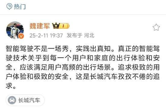 长城汽车CEO魏建军在个人微博上表示,智能驾驶技术应该满足用户高频的出行场景,而不是一场秀,真正的智能驾驶技术关乎到用户和家庭的出行体验和安全。此前,比亚迪宣布全系车型将搭载高阶智驾。 ...