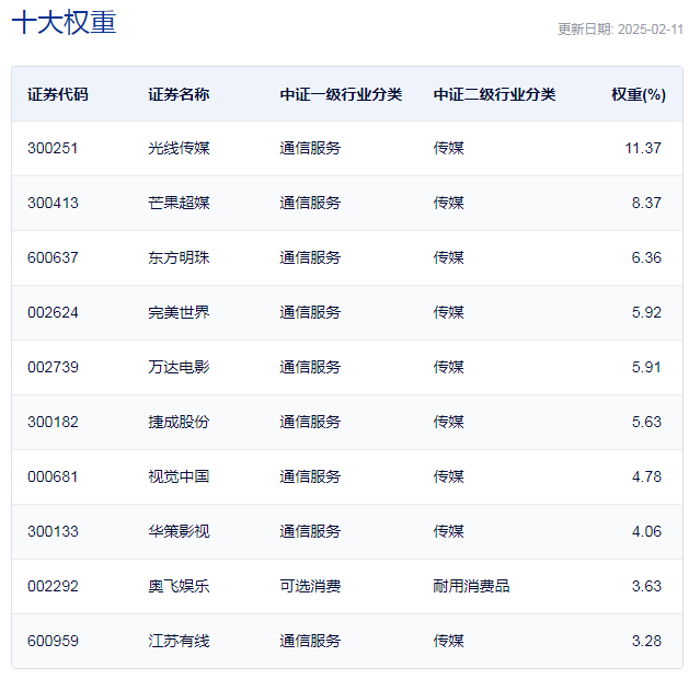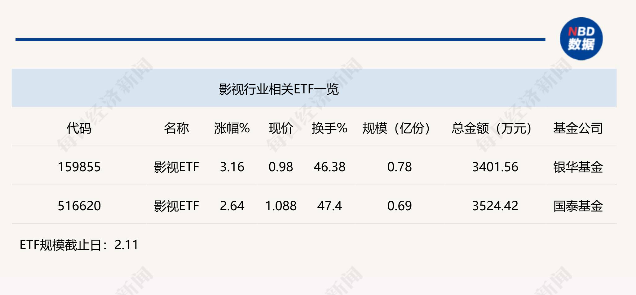 每经记者 刘明涛 每经编辑 叶峰 今日上午,DeepSeek产业链相关ETF继续全面大涨,多只云计算、大数据、软件以及信创ETF都超过2%,而在光线传媒的带领下,影视股也出现整体反攻,影视ETF(159855)半日涨幅达到3.16%,涨幅靠前。 市值增长方面,影视ETF上一次领涨行业ETF还要追溯到去年12月11日,经过两个月“过山车行情”,影视ETF(159855)和影视ETF(516620)规模都有所增长,但增长幅度不大,其中,影视ETF(516620)规模增长相对较多,其两个月内规模增长近1500万份。 投资逻辑来看,今年春节档,《哪吒之魔童闹海》成为超级爆款影片,在其带领下,2025年春节档电影市场总票房创下新高,票房的显著回暖为整体电影市场的发展注入强大动力;此外也带动了影院周边消费的复苏。整体来看,春节档为2025年全年电影产业的发展奠定了坚实基础。 点评:影视ETF(159855)和影视ETF(516620)今日上午分别上涨3.16%和2.64%,其中,影视ETF(159855)规模为0.78亿份,半日成交3402万元,上述两只ETF均追踪的是中证影视主题指数。 中证影视主题指数选取影视内容提供商(包括影视制作、网络剧制作和动漫制作等)、发行商、渠道商,以及其他受益于影视发展的沪深A股作为样本。 中证影视主题指数主要权重股 |