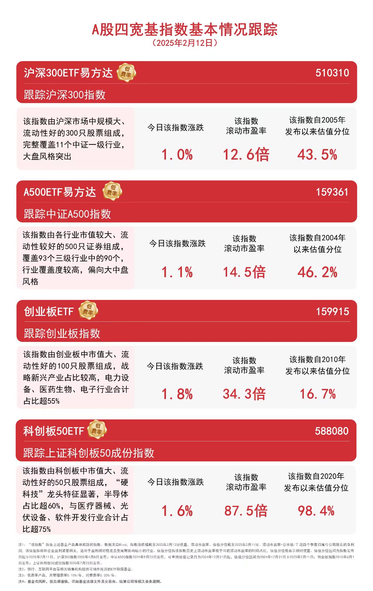 今日A股震荡上行,全市场成交额超1.7万亿元,全市场超3500只个股收涨。指数方面,中证A500指数上涨1.1%,沪深300指数上涨1.0%,创业板指数上涨1.8%,上证科创板50成份指数上涨1.6%。A500ETF易方达(159361)、创业板 ...