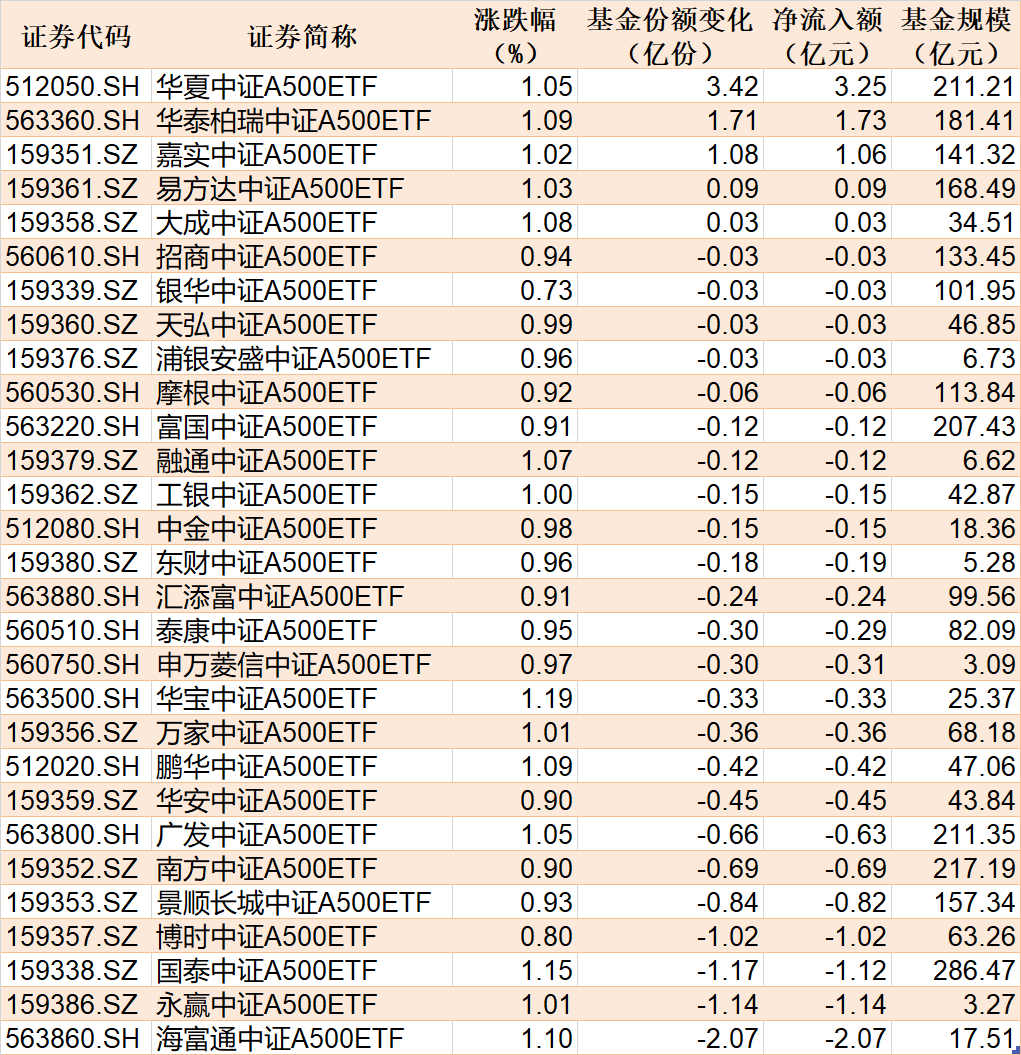 每经记者 叶峰 每经编辑 彭水萍 昨日市场全天震荡走高,创业板指领涨。盘面上,市场热点轮番活跃,个股涨多跌少,全市场超3500只个股上涨。从板块来看,芯片股午后爆发,DeepSeek概念股再度走强,地产股尾盘异动。下跌方面,黄金等周期股集体调整。 Wind数据显示,在2月12日的非货币ETF市场中,华安黄金ETF基金份额增加0.85亿份,净流入额为5.55亿元;华夏中证A500ETF基金份额增加3.42亿份,净流入额为3.25亿元;鹏扬中债-30年期国债ETF基金份额增加0.03亿份,净流入额为3.21亿元。 与此同时,华夏上证科创板50ETF基金份额减少16.38亿份,净流出额为17.84亿元;嘉实上证科创板芯片ETF基金份额减少5.07亿份,净流出额为7.81亿元;国联安中证全指半导体ETF基金份额减少5.74亿份,净流出额为6.20亿元。 此外,昨日场内29只中证A500ETF合计净流出4.65亿元,其中有5只获得资金增持。 总体看来,Wind数据显示,2月12日全市场ETF份额达到26210.14亿份;总规模为38224.19亿元。份额增加最大的行业为房地产,目前有2只基金跟踪;份额增加最大的主题为中证军工指数,有4只基金跟踪。份额增加最大的指数标的为SGE黄金9999(+2.13%),有7只基金跟踪;收益最高的指数标的为中证影视(+4.40%),有2只基金跟踪。