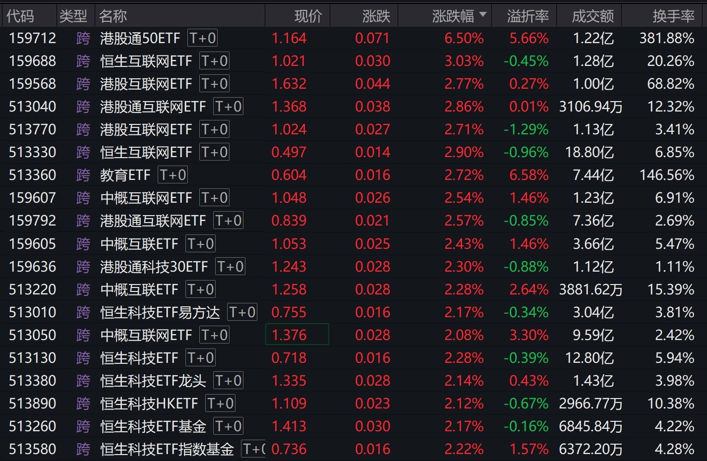 每经记者 叶峰 每经编辑 肖芮冬 港股早盘走强,恒生科技指数涨近2%,场内多只港股相关ETF量价齐升。 开盘半小时,港股通50ETF涨超6%,换手率近400%,教育ETF涨近3%,换手率超140%。 港股近期持续大涨主要受全球经济复苏、企业盈利改善、政策支持、国际环境改善及技术性反弹等多重因素推动。 但值得投资者注意的是,跨境ETF为T+0交易,允许投资者在同一交易日内多次买卖,增加了交易频率,推高换手率。虽然高换手率反映了市场活跃度,但投资者需注意频繁交易可能带来的成本和风险。 |