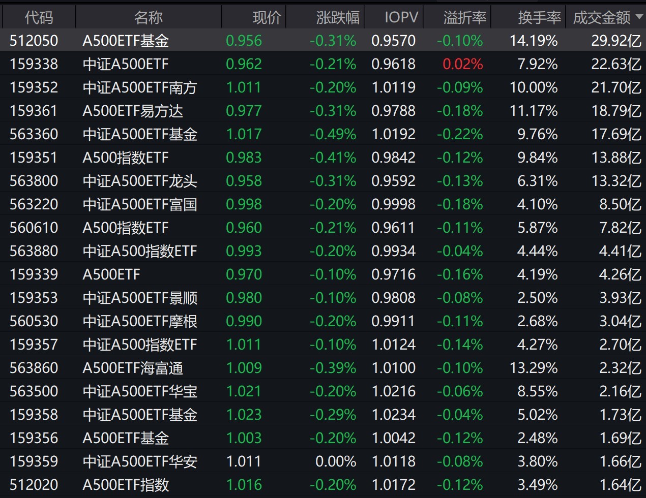 每经记者 叶峰 每经编辑 肖芮冬 市场早盘震荡调整,三大指数小幅下跌。中证A500指数下跌0.21%,成分股中光线传媒涨超18%,四川长虹、航锦科技、用友网络涨停。 截至上午收盘,场内29只跟踪中证A50 ...