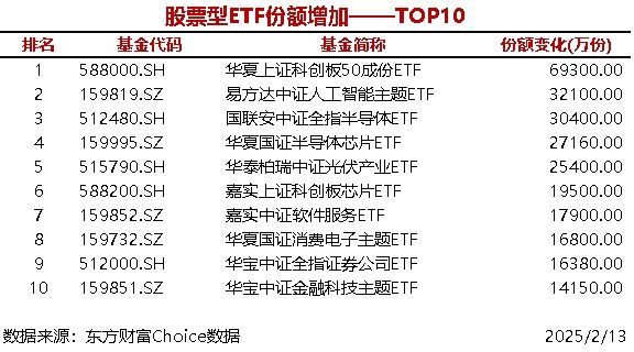 每经AI快讯,据东方财富Choice数据统计,昨日共10只股票型ETF当日份额增加超1亿份,华夏上证科创板50成份ETF增加6.93亿份,易方达中证人工智能主题ETF增加3.21亿份。 ...