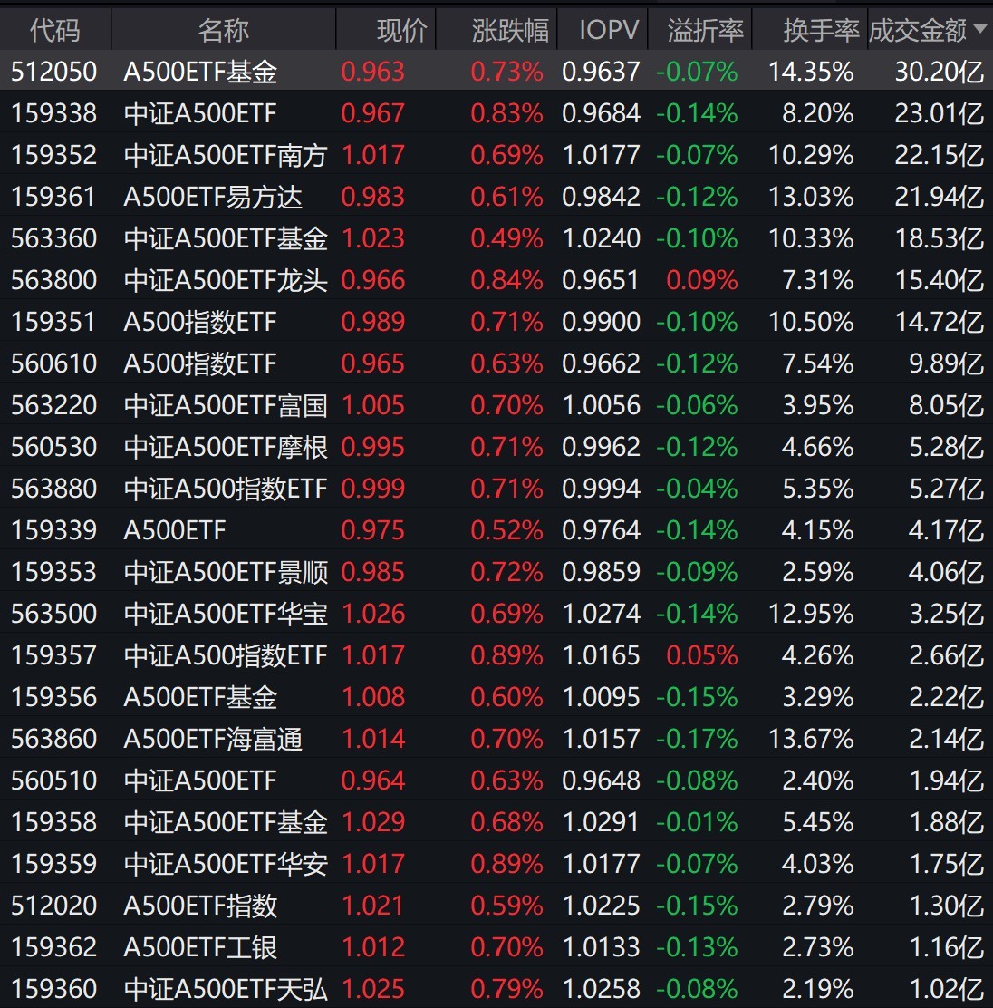 每经记者 叶峰 每经编辑 肖芮冬 市场早盘震荡走高,创业板指领涨。中证A500指数上涨0.83%,成分股中光线传媒、易华录涨20%。 截至上午收盘,场内29只跟踪中证A500指数的ETF涨约0.7%,其中有23只中证A500相关ETF成交额超1亿元、7只超10亿元,A500ETF基金、中证A500ETF、中证A500ETF南方、A500ETF易方达早盘成交额超20亿元。 此外,有8只中证A500相关ETF换手率超10%,其中A500ETF永赢早盘换手率达24.36%。 有券商表示,当前市场即将进入两会政策预热期,两会期间预计将迎来政策密集落地期,为大盘进一步上行打开空间。建议围绕业绩高景气与产业趋势明确的科技、红利资产及低位消费核心资产展开布局。 |